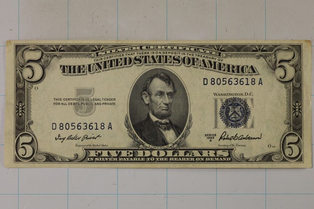 #95 Lot 95 1953-A US $5 SILVER CERTIFICATE CRISP AU UNC BLUE