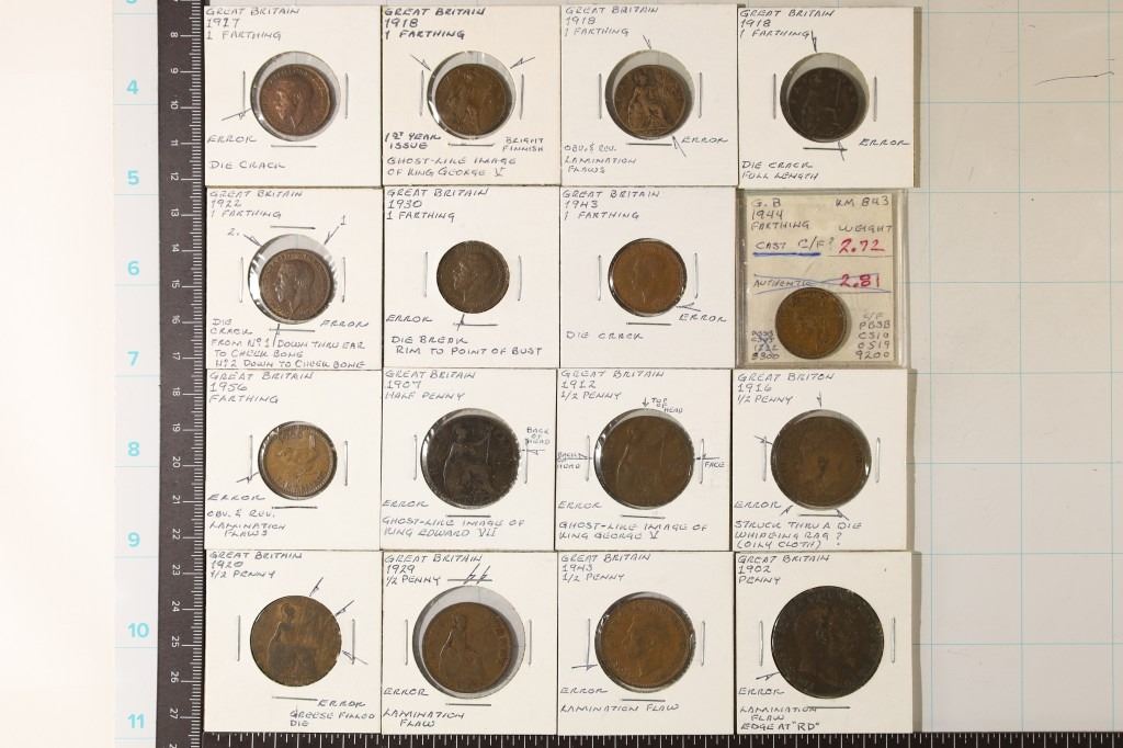 FARTHINGS, HALF PENNIES AND PENNIY. ERRORS INCLUDE DIE CRACKS, STRUCK THROUGH, LAMINATION FLAWS, GREESE FILLED DIES ETC...