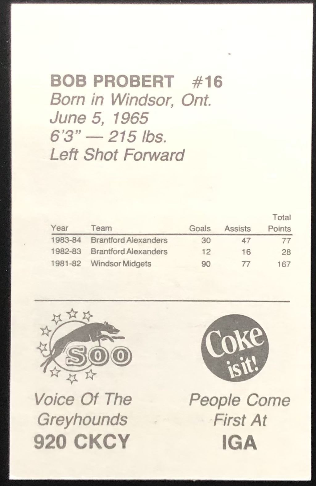 Lot 15 1984-85 BOB PROBERT JUNIOR HOCKEY POLICE CARD