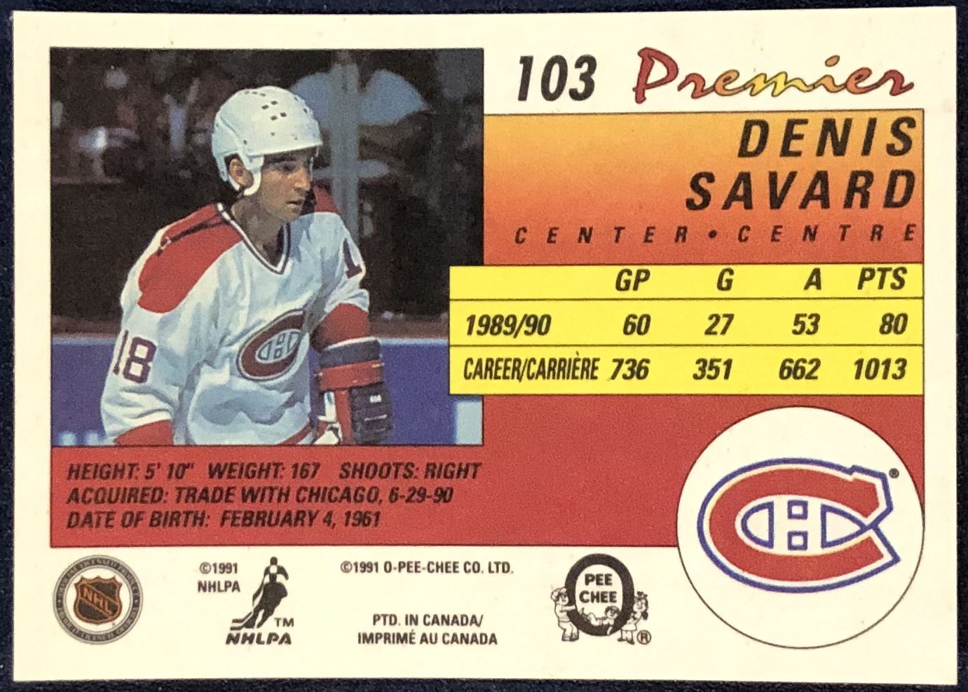 Lot 76 1990-91 O-PEE-CHEE PREMIER NHL DENIS SAVARD (HOF)