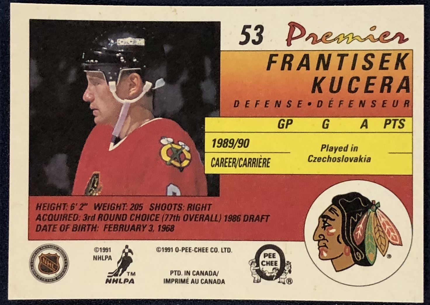 Lot 79 1990-91 O-PEE-CHEE PREMIER NHL FRANK KUCERA ROOKIE CARD