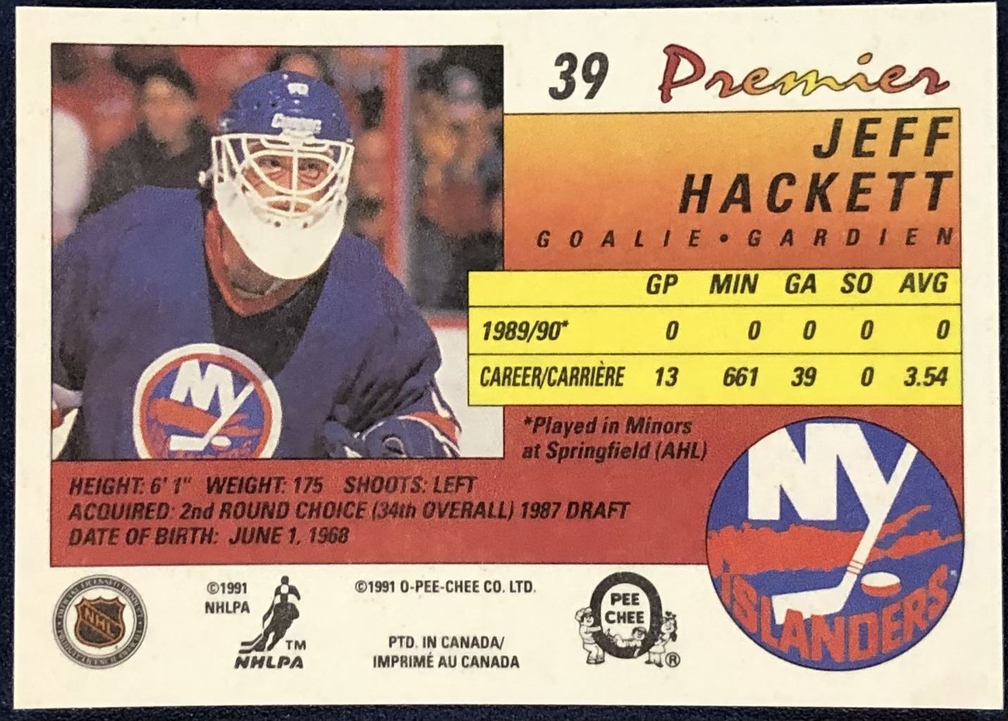 Lot 82 1990-91 O-PEE-CHEE PREMIER NHL JEFF HACKETT ROOKIE CARD