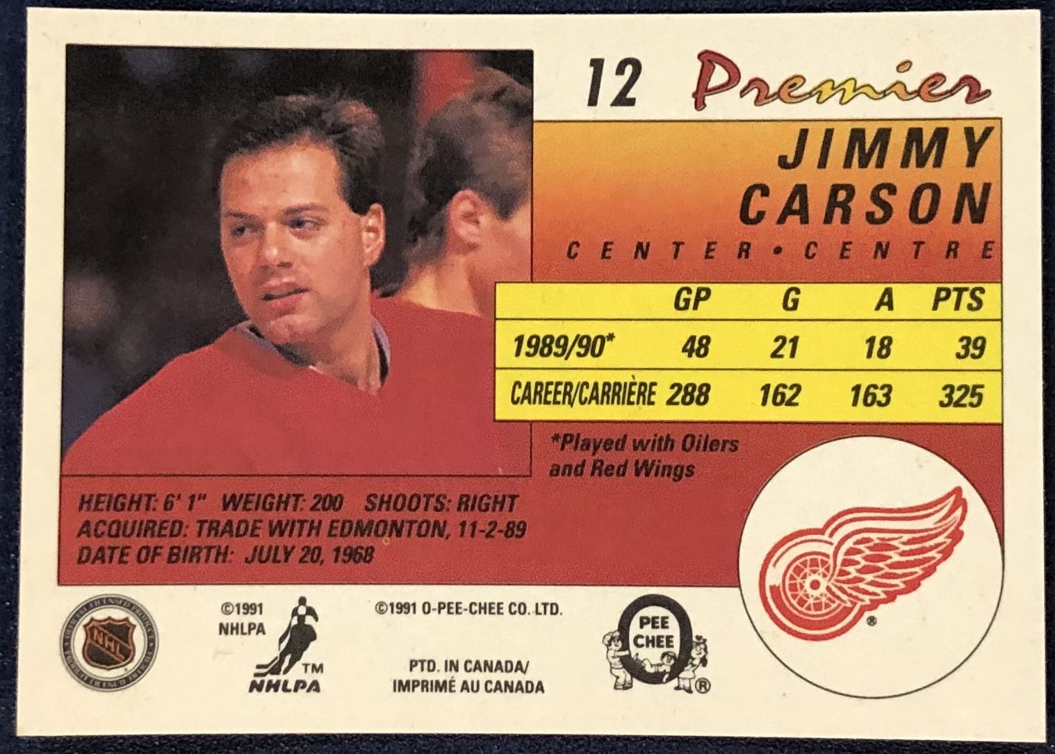 Lot 84 1990-91 O-PEE-CHEE PREMIER NHL JIMMY CARSON