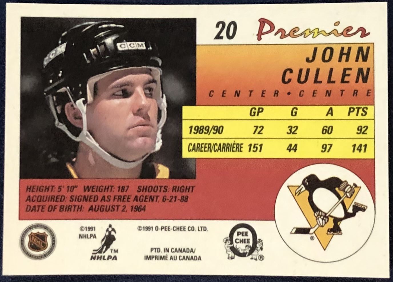 Lot 89 1990-91 O-PEE-CHEE PREMIER NHL JOHN CULLEN(HOF)