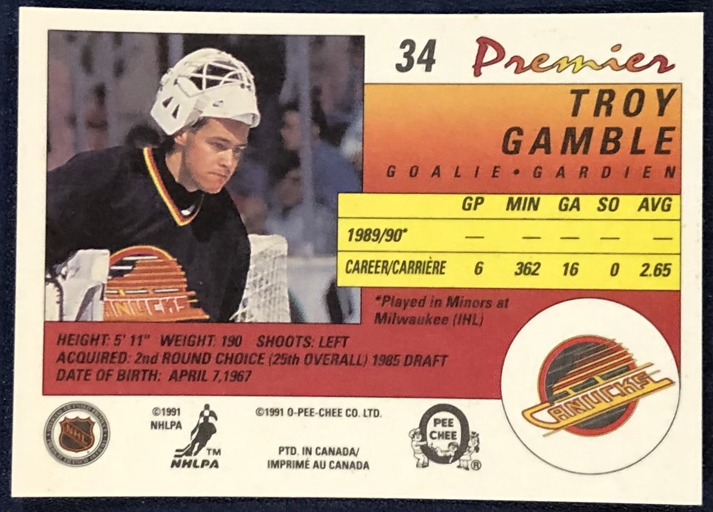 Lot 127 1990-91 O-PEE-CHEE PREMIER NHL TROY GAMBLE ROOKIE CARD