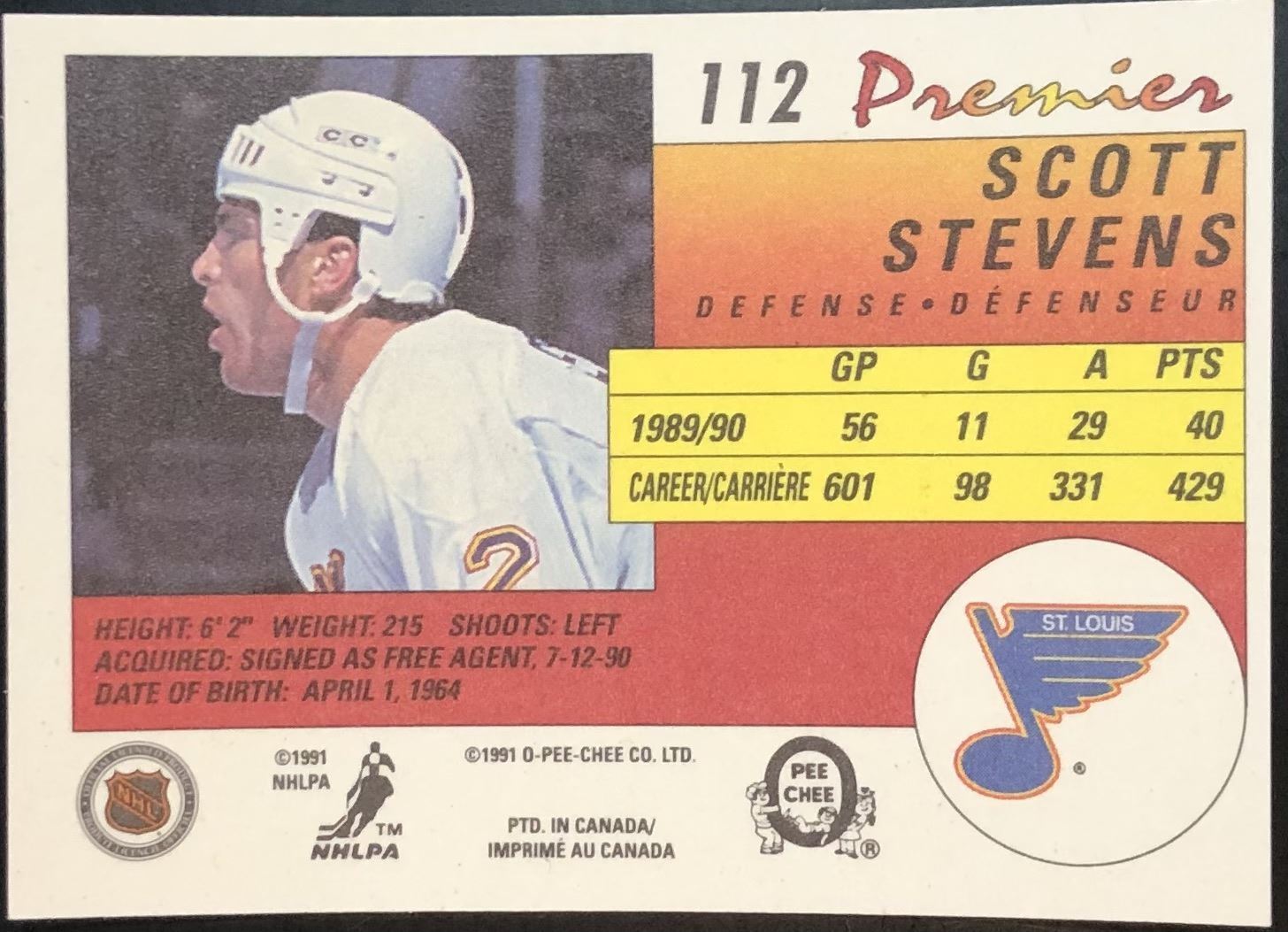 Lot 129 1990-91 O-PEE-CHEE PREMIER SCOTT STEVENS (HOF)