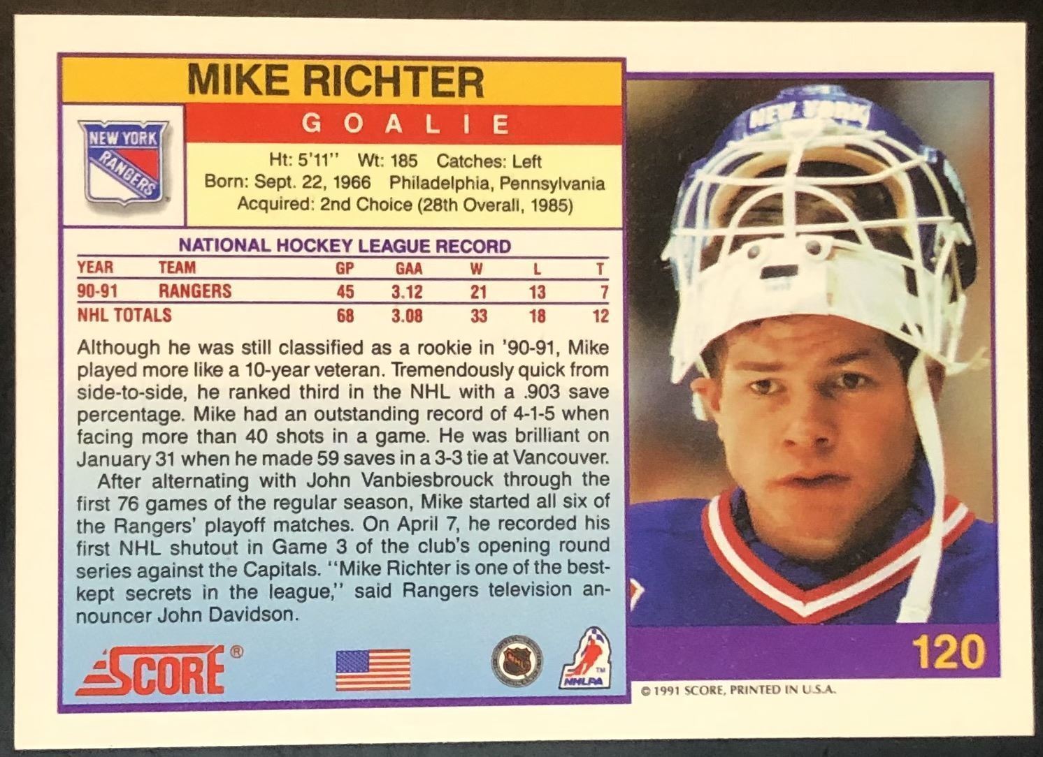Lot 183 1991-92 U.S. SCORE MIKE RICHTER (HOF) ROOKIE CARD