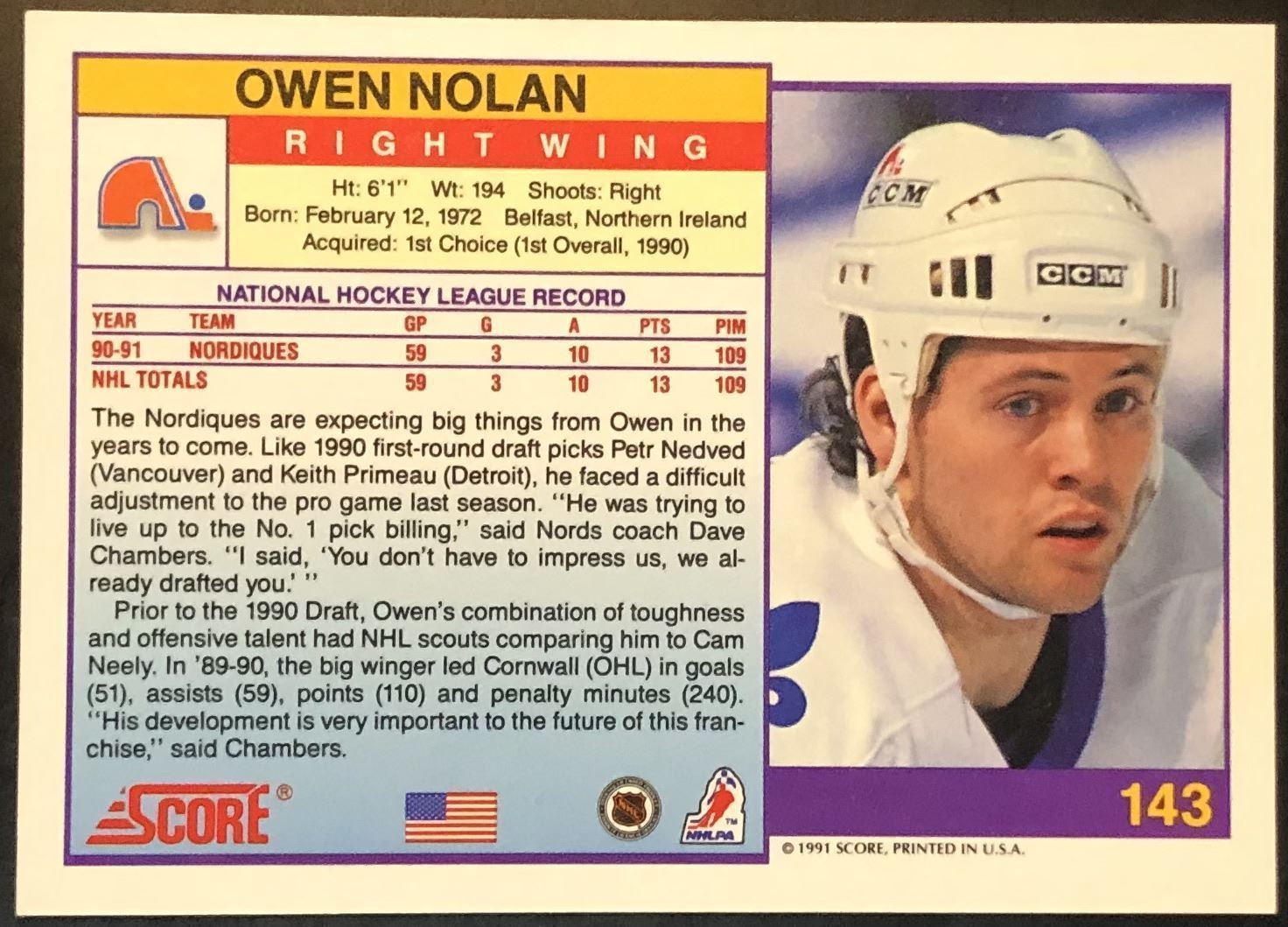 Lot 184 1991-92 U.S. SCORE OWEN NOLAN ROOKIE CARD