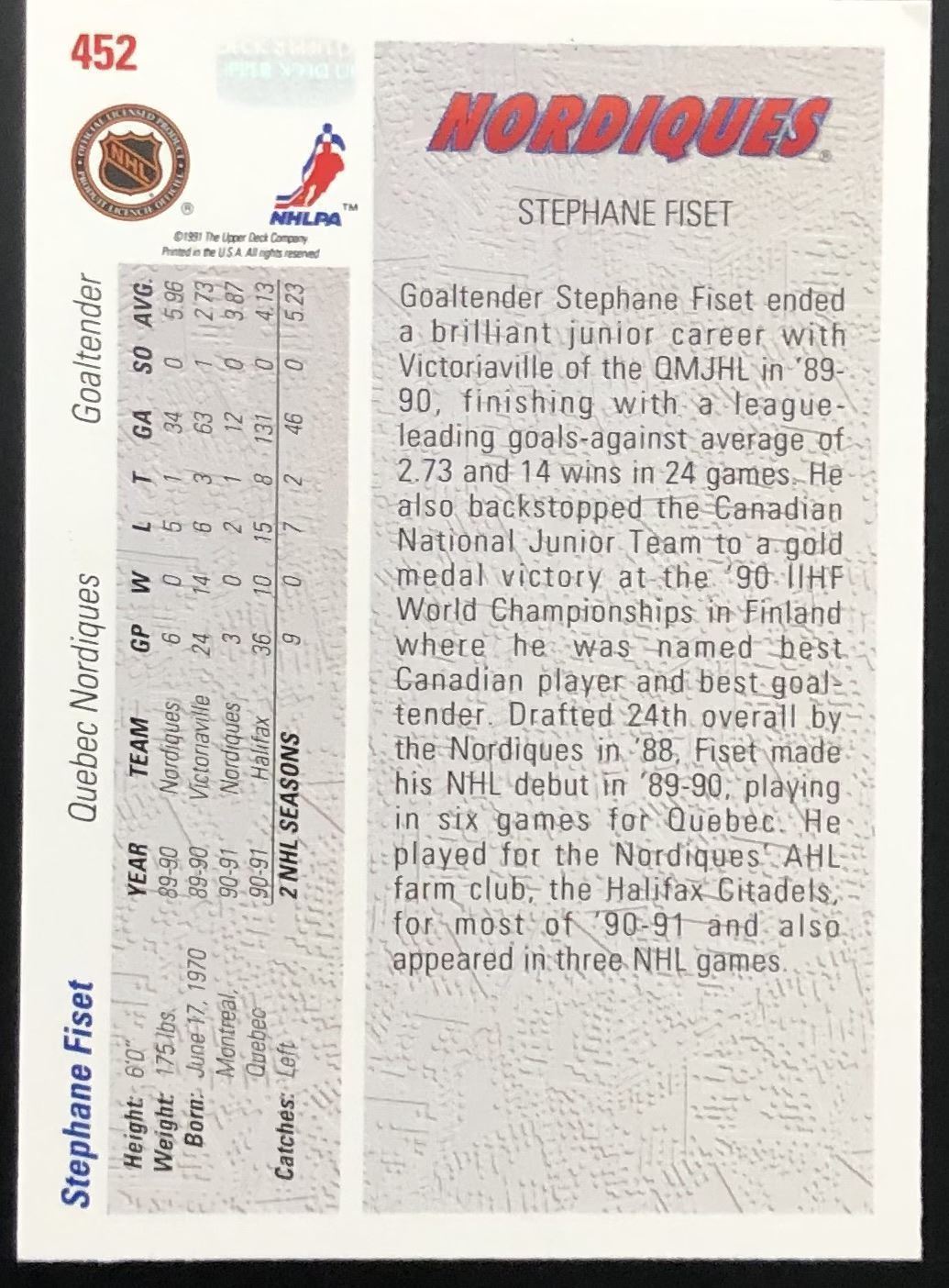 Lot 190 1991-92 UPPER DECK STEPHANE FISET ROOKIE CARD