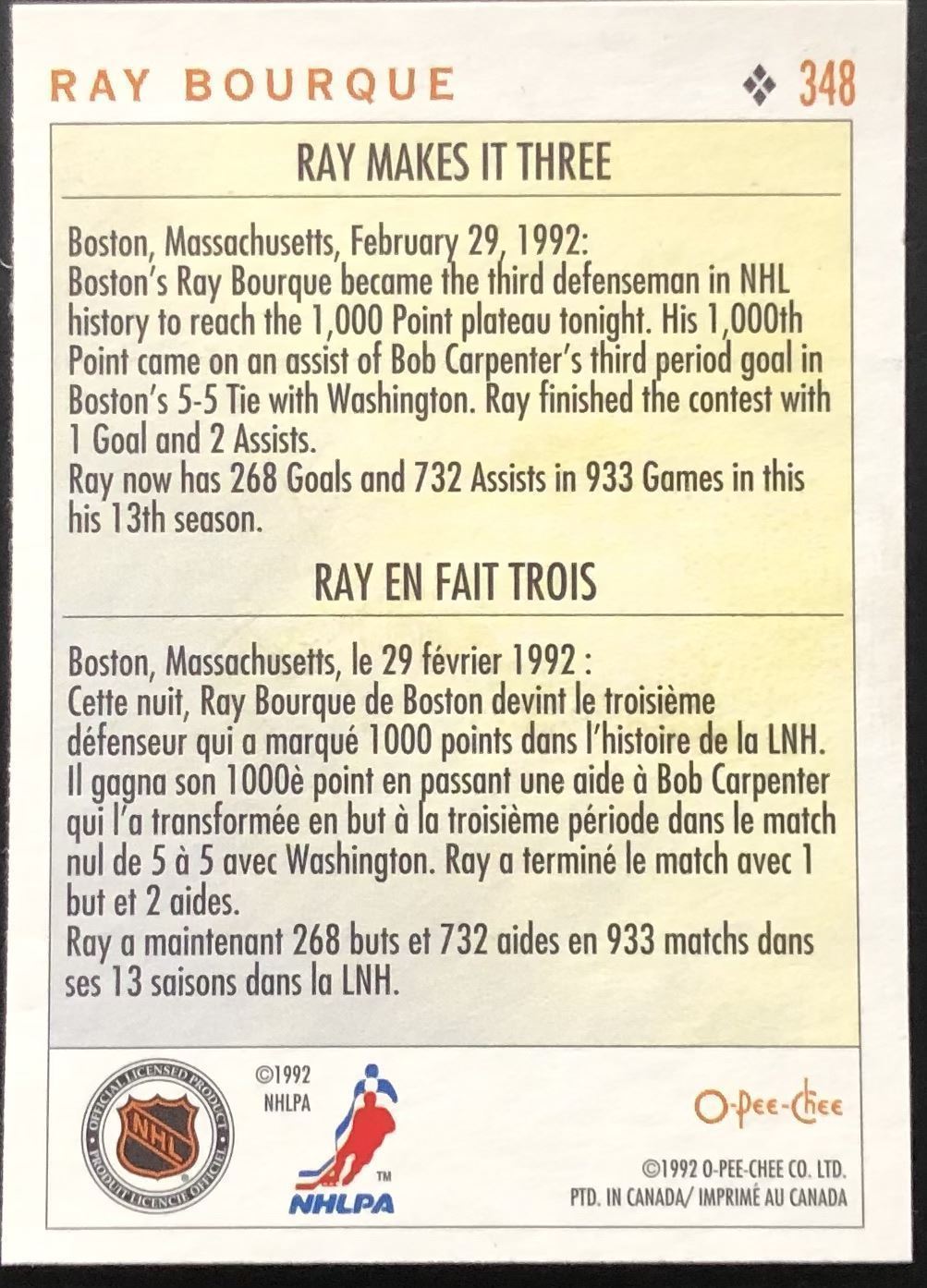 Lot 194 1992-93 O-PEE-CHEE RAY BOURQUE (HOF)