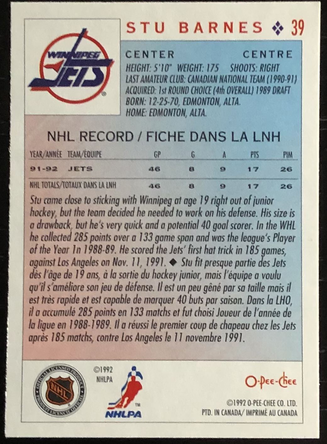 Lot 195 1992-93 O-PEE-CHEE STU BARNES ROOKIE CARD