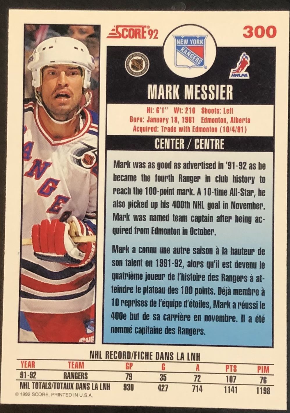 Lot 203 1992-93 SCORE MARK MESSIER (HOF)