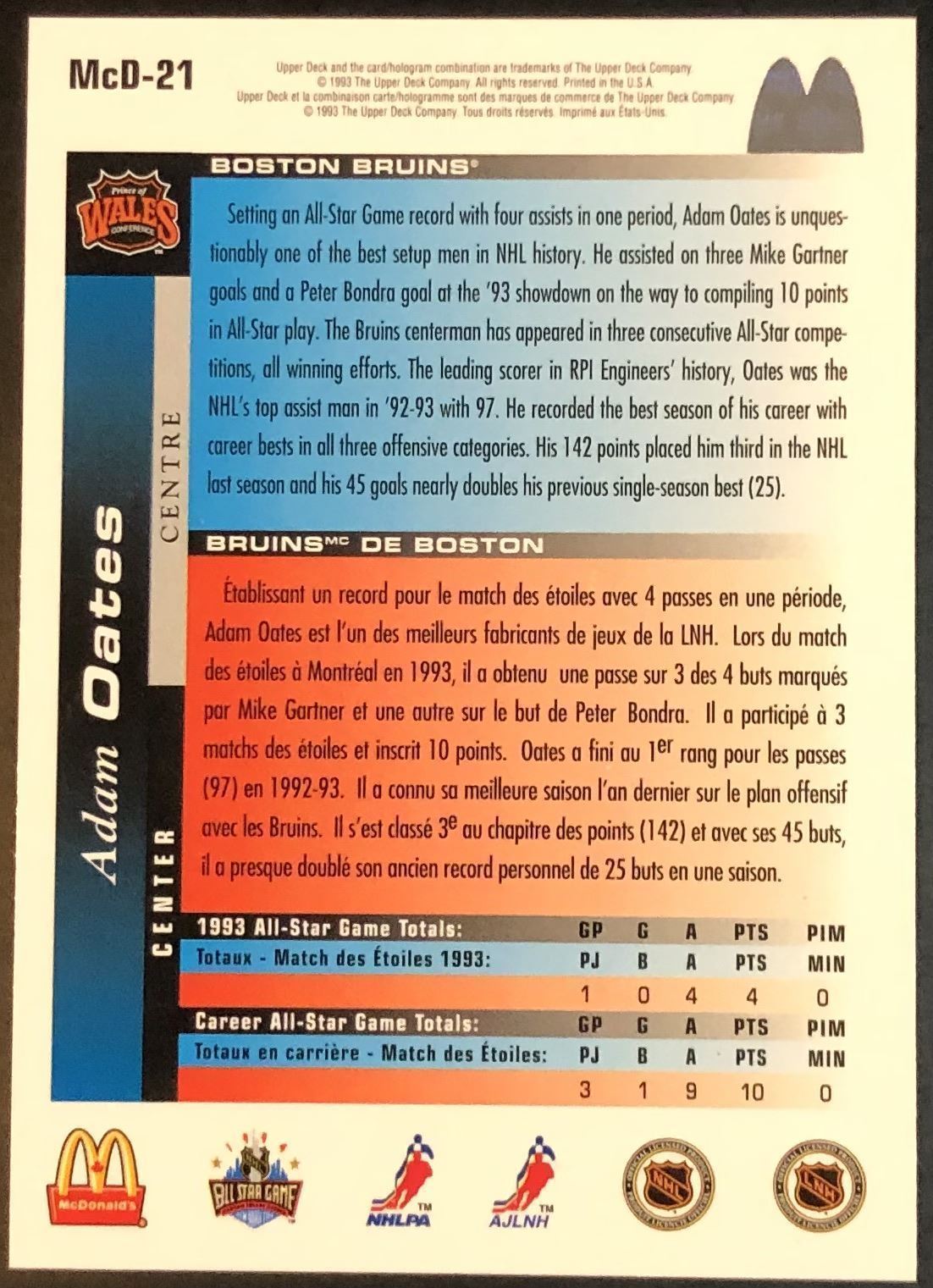 McDonald's card #McD-21 NHL, hockey, UD, hall of fame