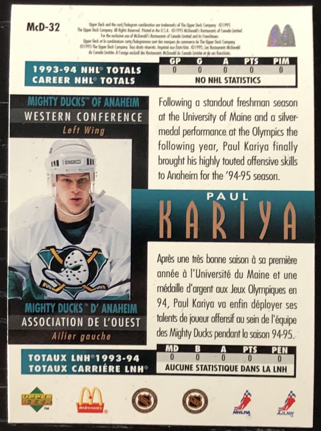 McDonald's card #McD-32 NHL, hockey, UD, rookie, hall of fame