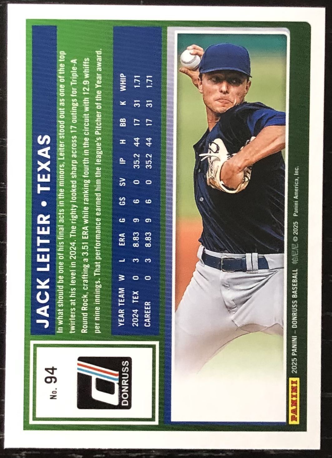 Lot 312 2025 DONRUSS JACK LEITER ROOKIE CARD