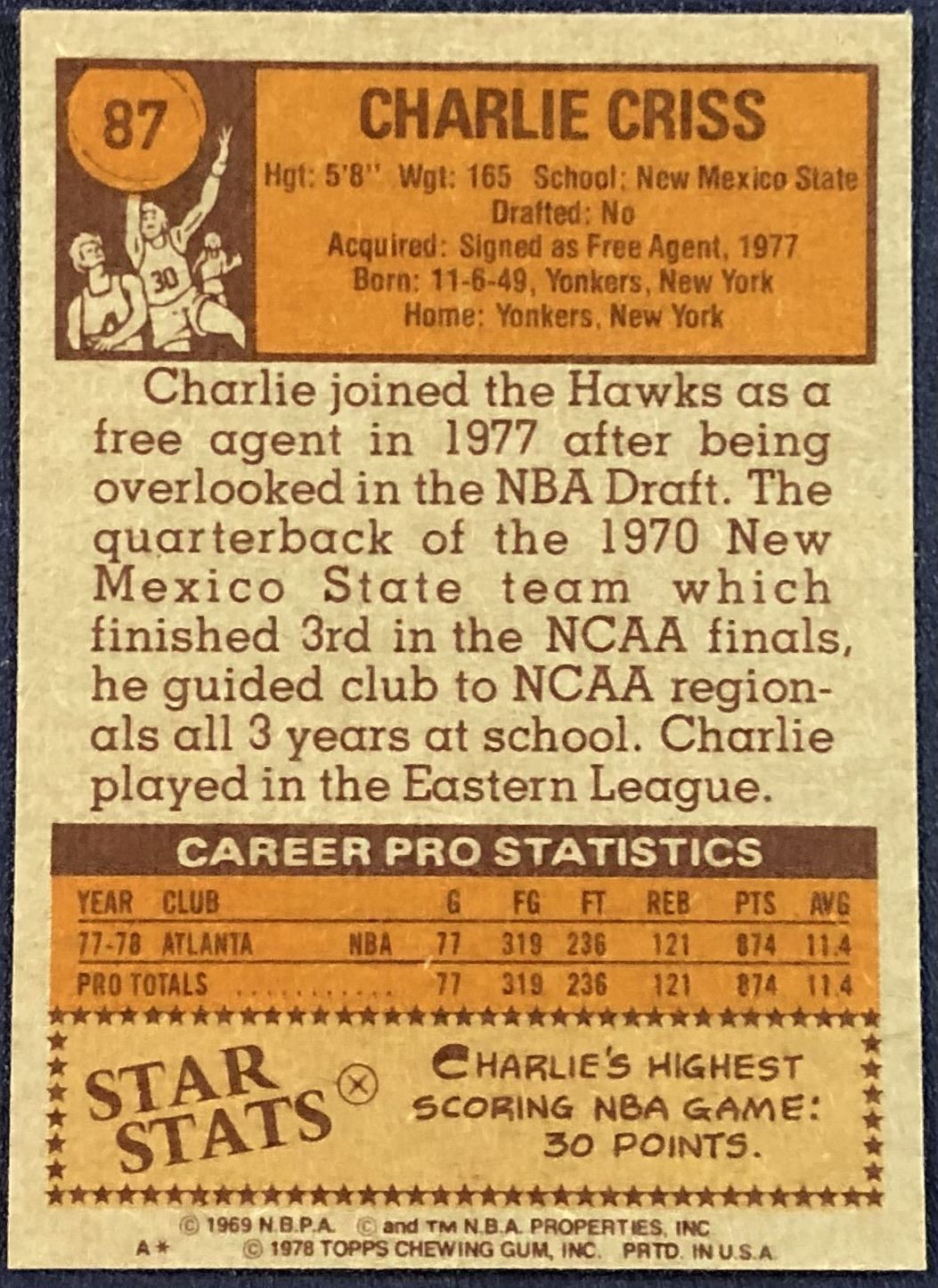 Lot 387 1978-79 TOPPS CHARLIE CRISS ROOKIE CARD