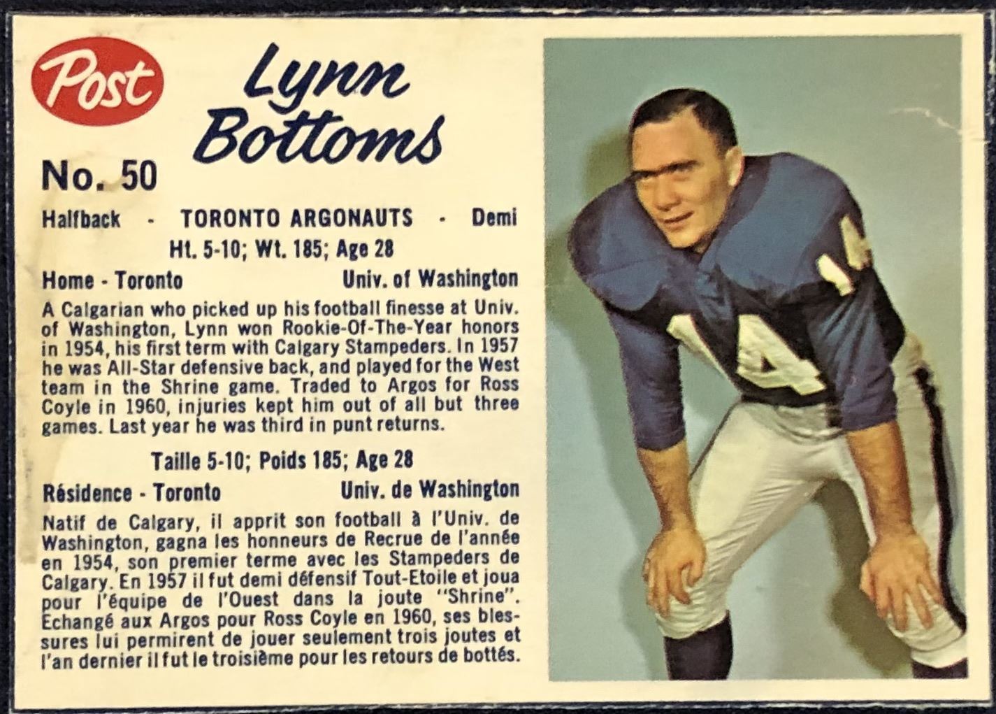 Lot 396 1962 POST CEREAL CFL LYNN BOTTOMS