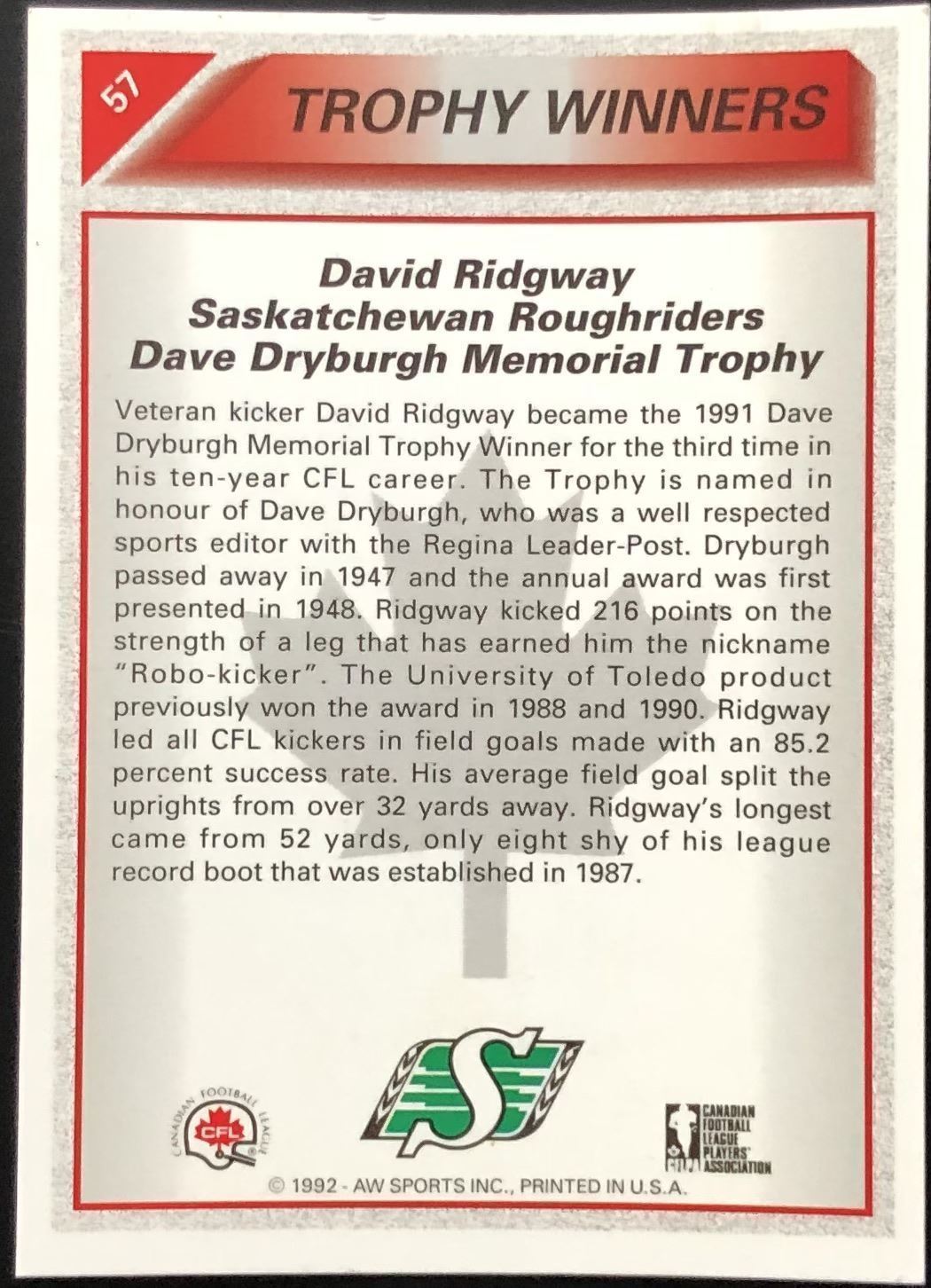 Lot 412 1991 AW SPORTS CFL DAVE RIDGWAY (HOF)