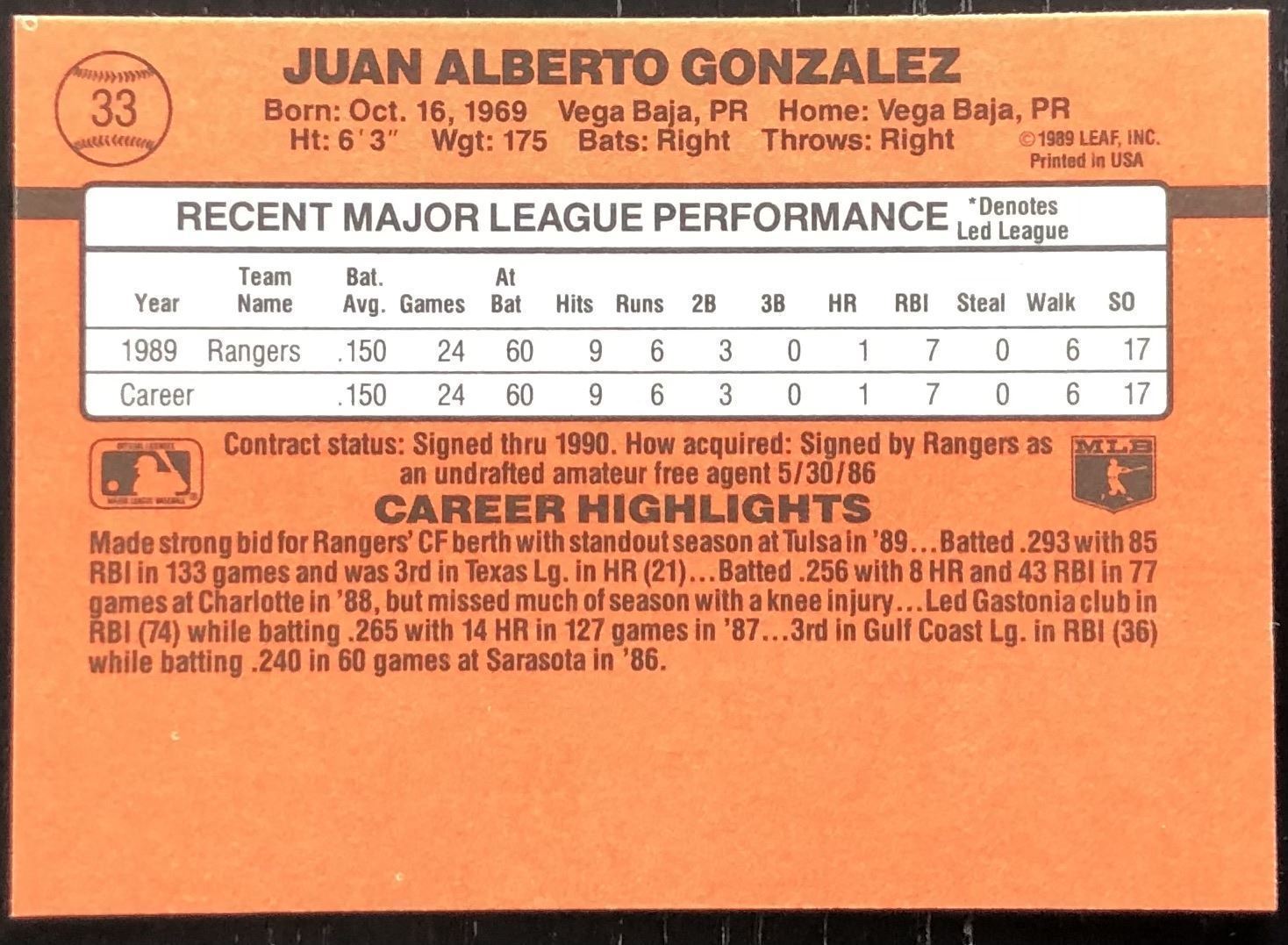 Lot 420 1990 DONRUSS JUAN GONZALEZ ROOKIE CARD