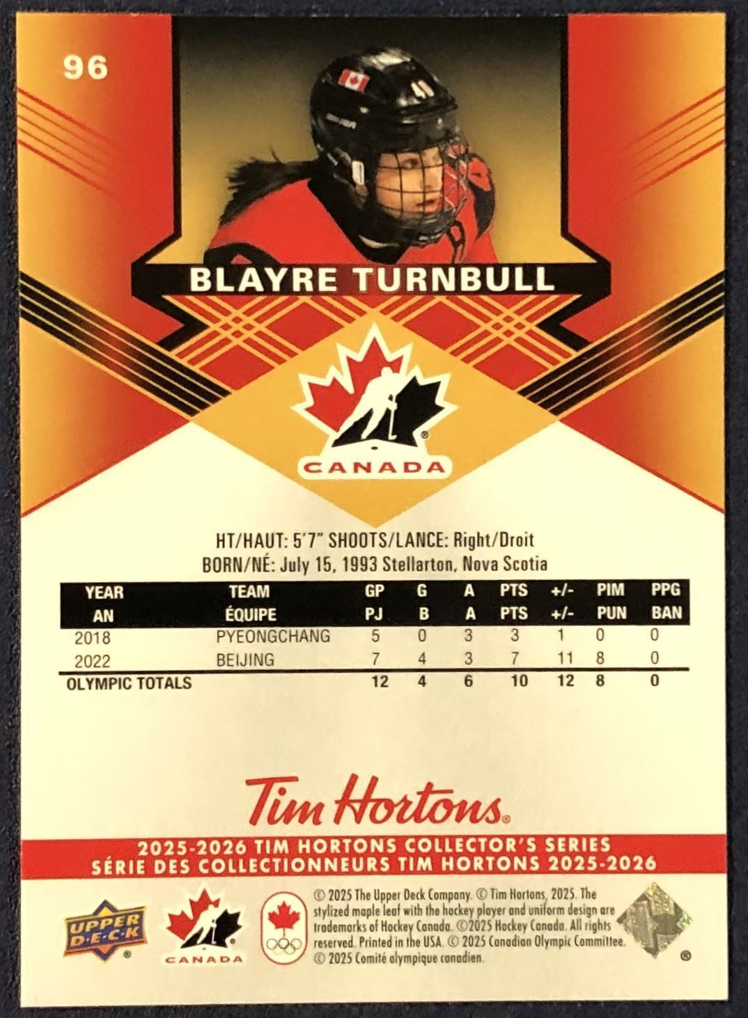 Tim Hortons card #96 NHL, hockey, UD, regional