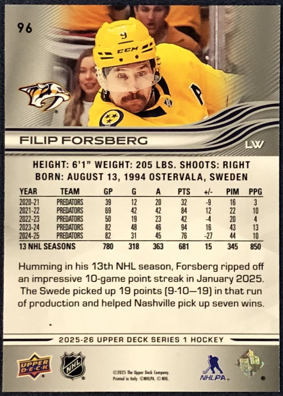 Lot 525 2025-26 UPPER DECK FILIP FORSBERG