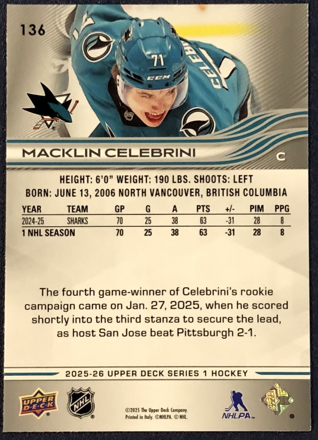 Lot 535 2025-26 UPPER DECK MACKLIN CELEBRINI ROOKIE CARD