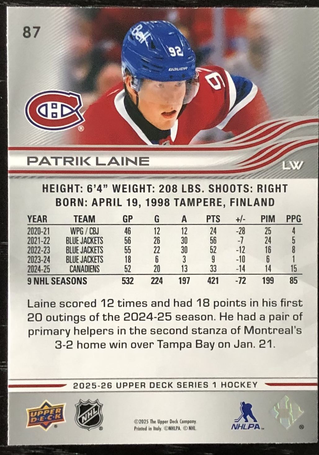 Lot 554 2025-26 UPPER DECK PATRIK LAINE