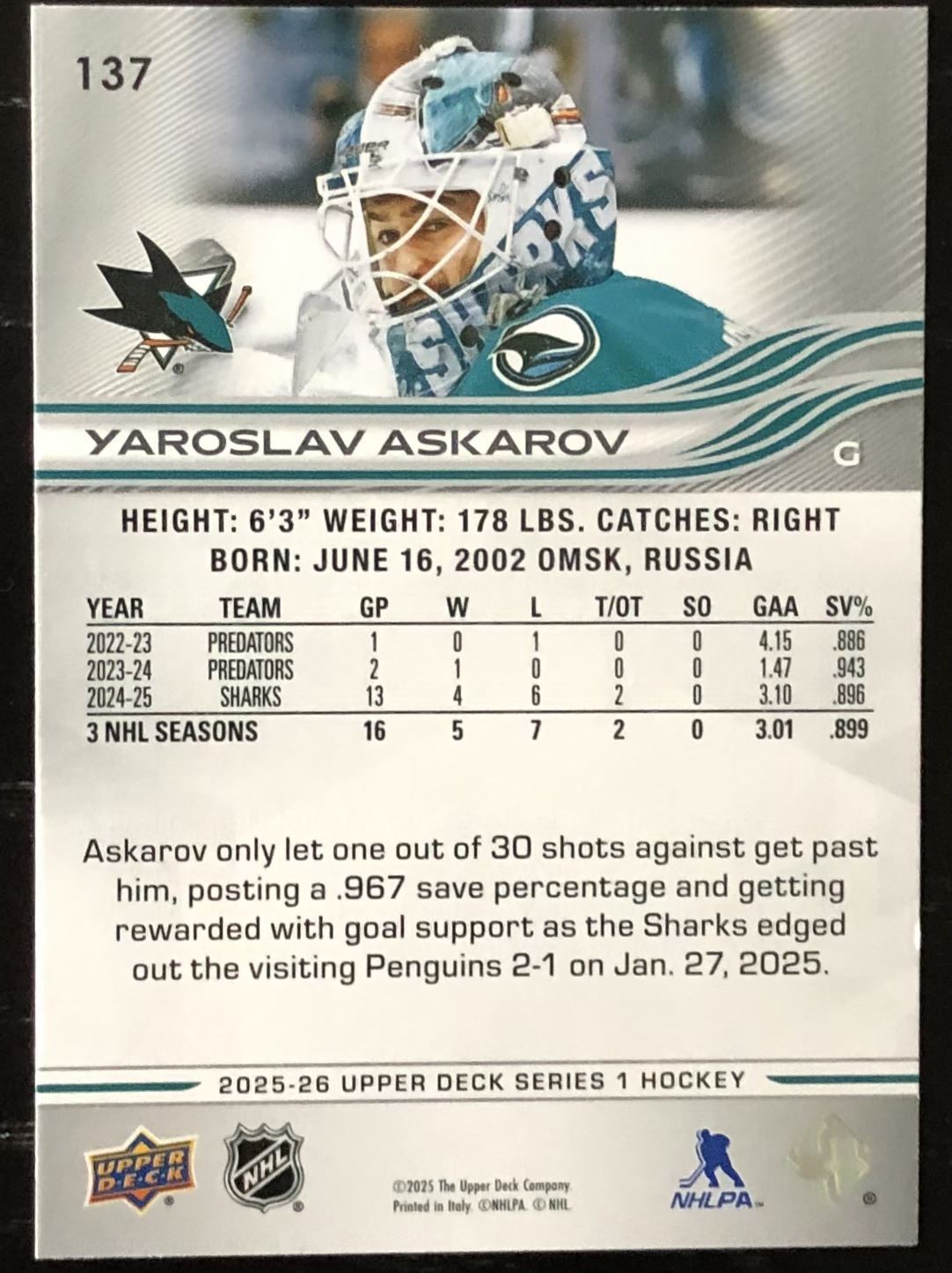 Lot 565 2025-26 UPPER DECK YAROSLAV ASKAROV ROOKIE CARD