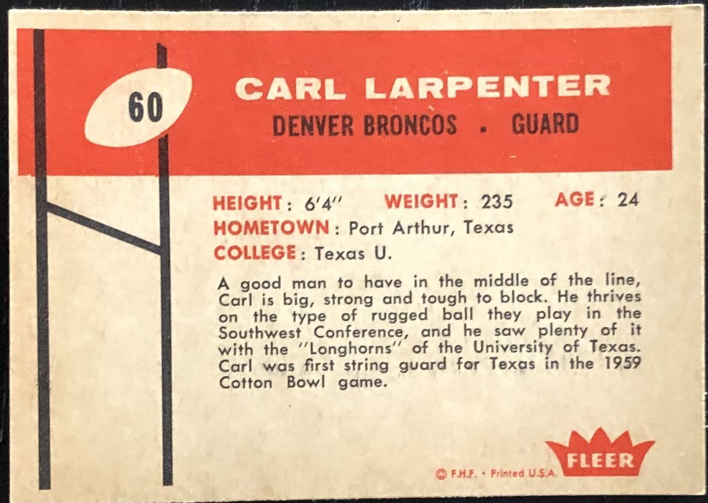 Lot 571 1960 FLEER NFL CARL LARPENTER
