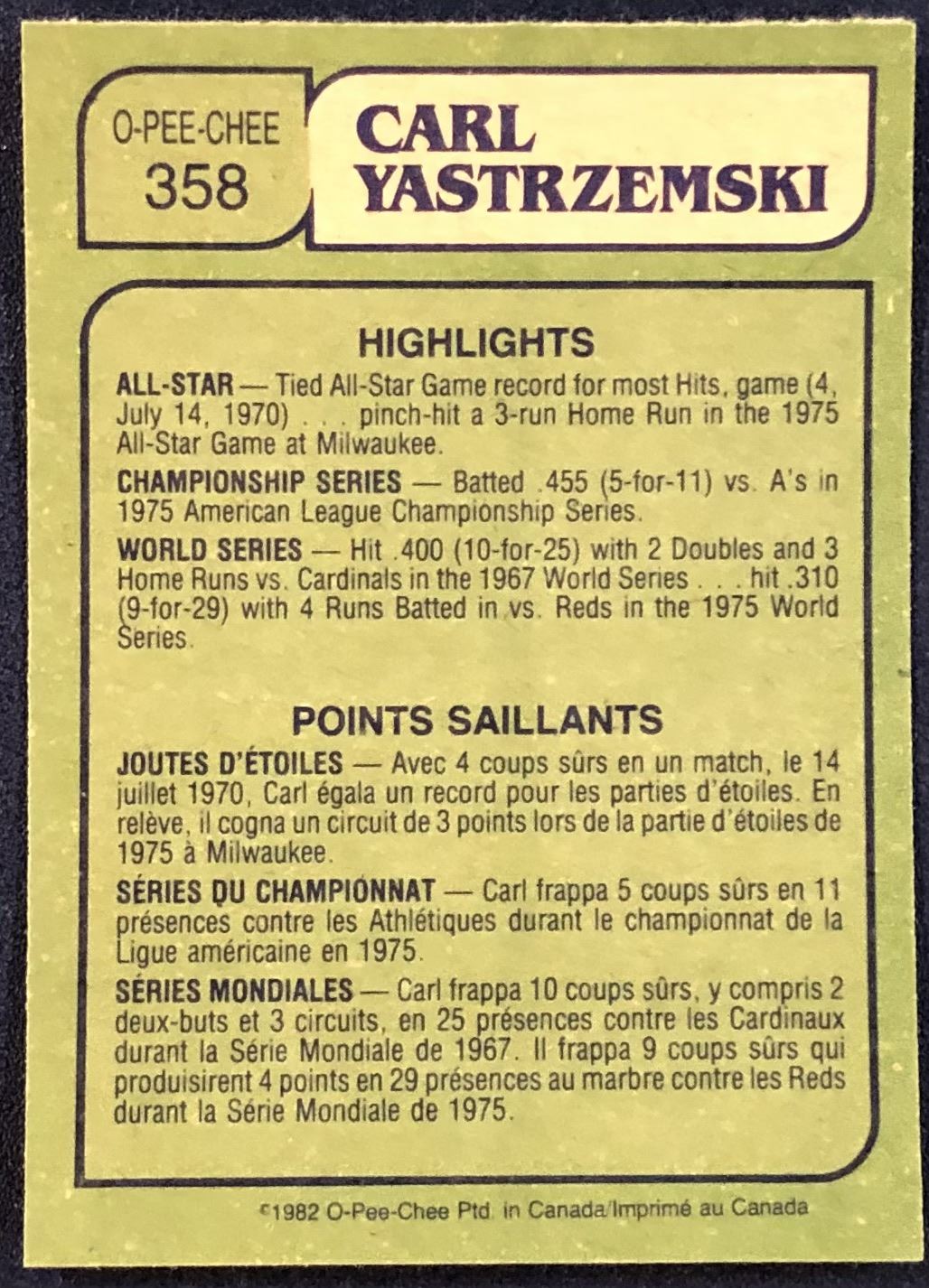 Lot 619 1982 O-PEE-CHEE BASEBALL CARL YASTRZEMSKI (HOF)