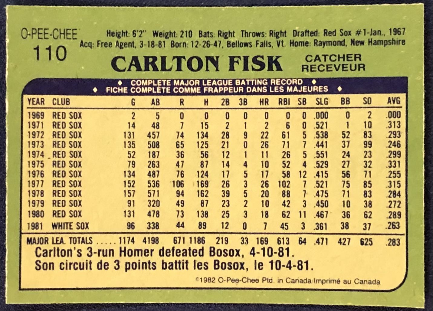 Lot 620 1982 O-PEE-CHEE BASEBALL CARLTON FISK (HOF)