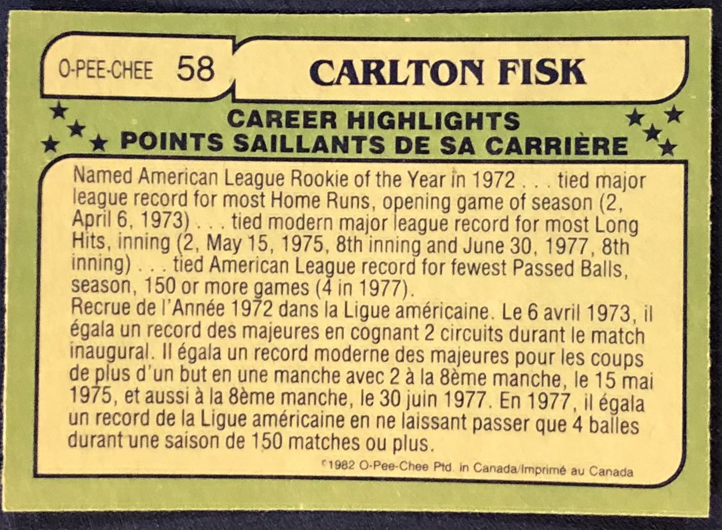 Lot 621 1982 O-PEE-CHEE BASEBALL CARLTON FISK (HOF)