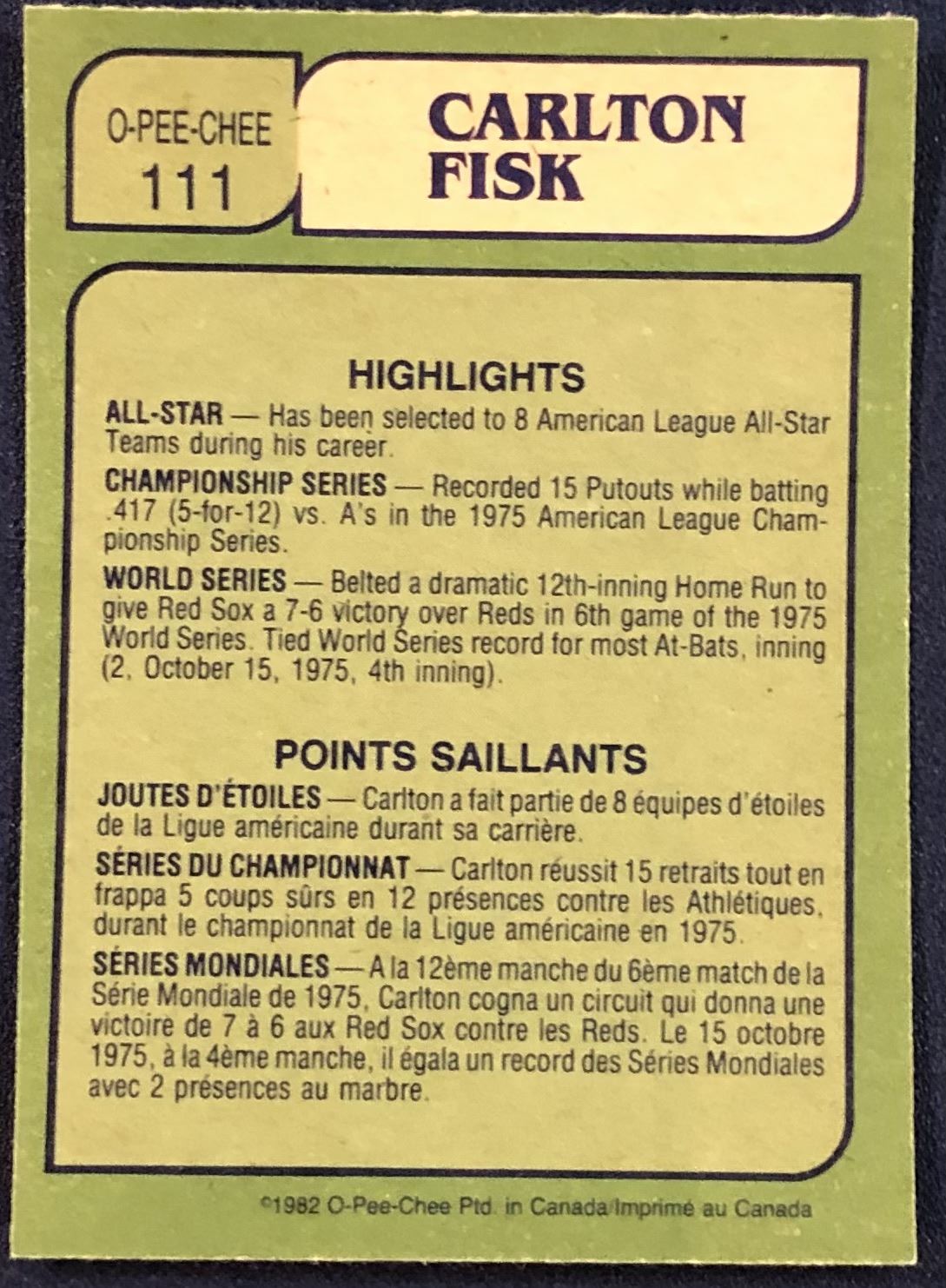 Lot 622 1982 O-PEE-CHEE BASEBALL CARLTON FISK (HOF)
