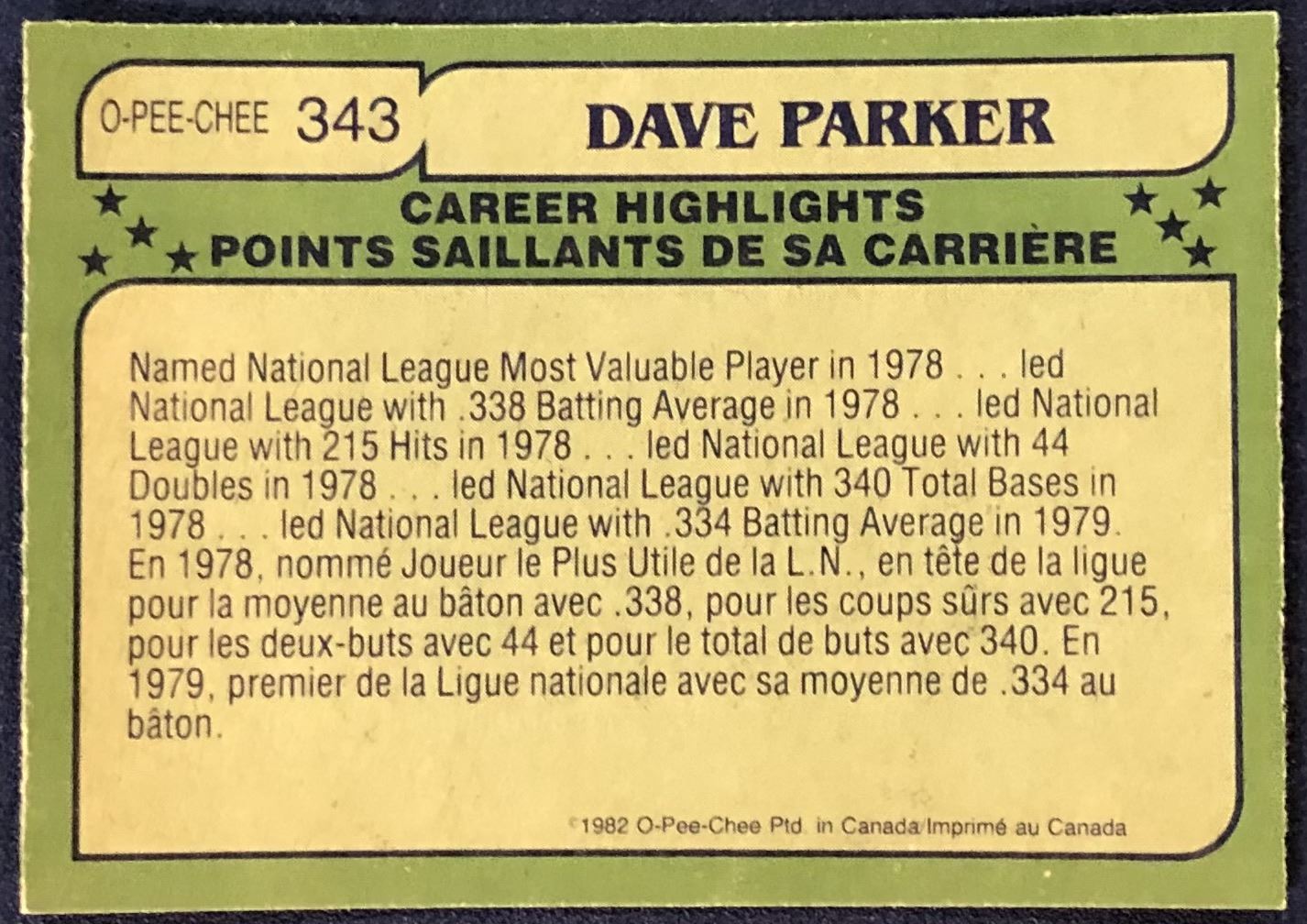 Lot 624 1982 O-PEE-CHEE BASEBALL DAVE PARKER (HOF)