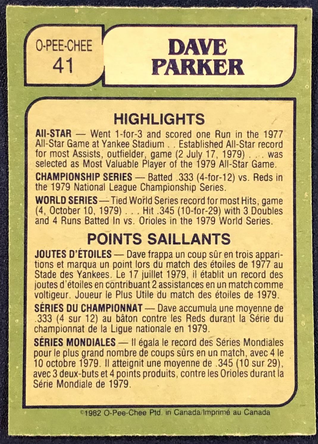 Lot 625 1982 O-PEE-CHEE BASEBALL DAVE PARKER (HOF)