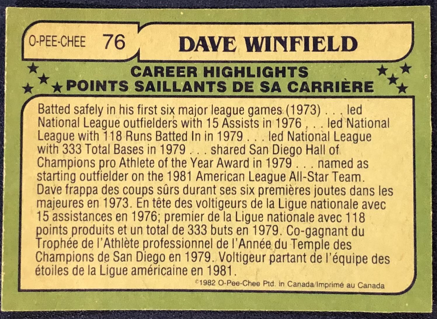 Lot 630 1982 O-PEE-CHEE BASEBALL DAVE WINFIELD (HOF)