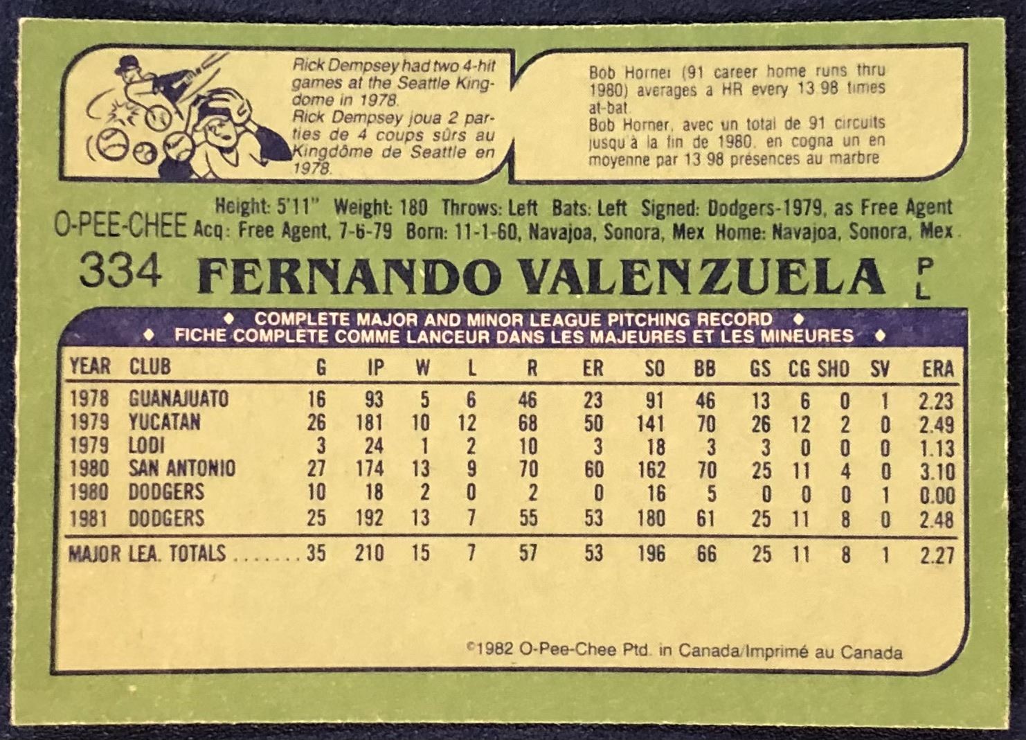 Lot 634 1982 O-PEE-CHEE BASEBALL FERNANDO VALENZUELA