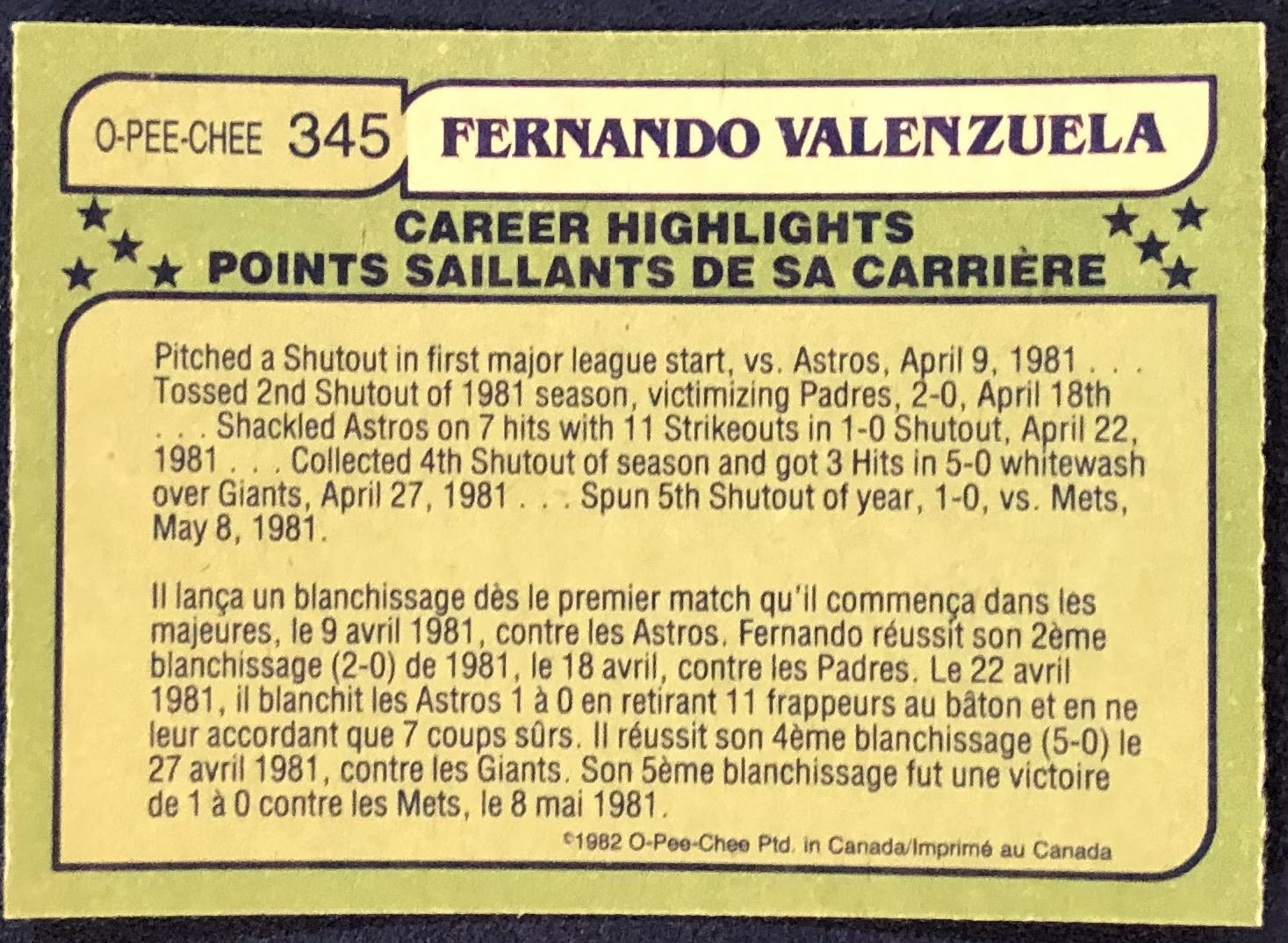 Lot 635 1982 O-PEE-CHEE BASEBALL FERNANDO VALENZUELA