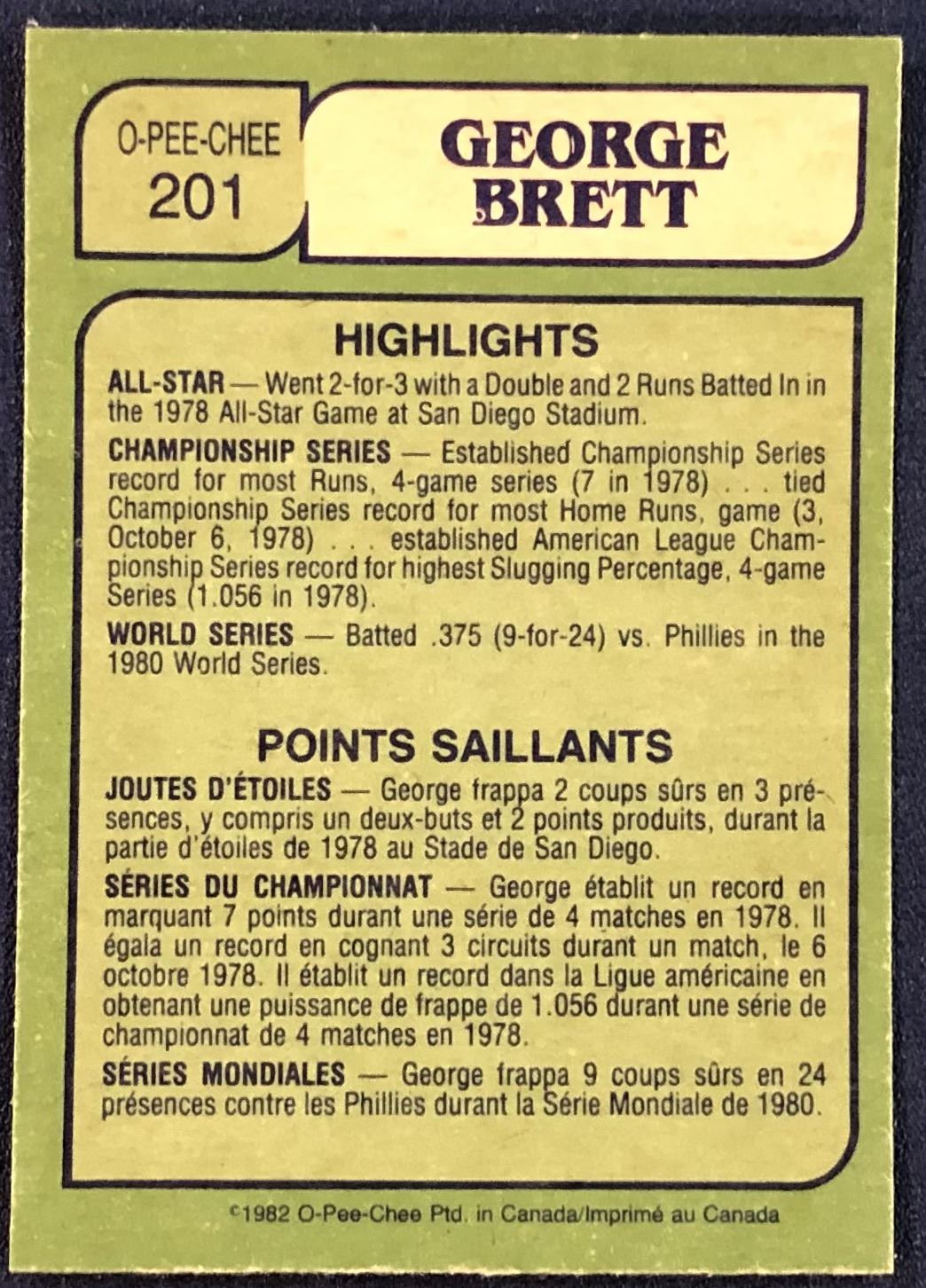 Lot 640 1982 O-PEE-CHEE BASEBALL GEORGE BRETT (HOF)