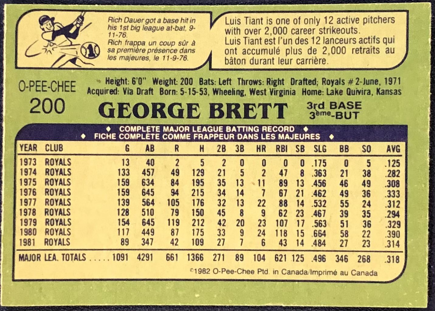 Lot 641 1982 O-PEE-CHEE BASEBALL GEORGE BRETT (HOF)