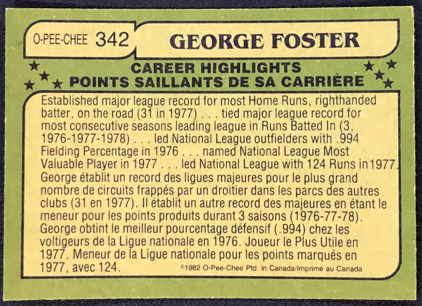 Lot 642 1982 O-PEE-CHEE BASEBALL GEORGE FOSTER