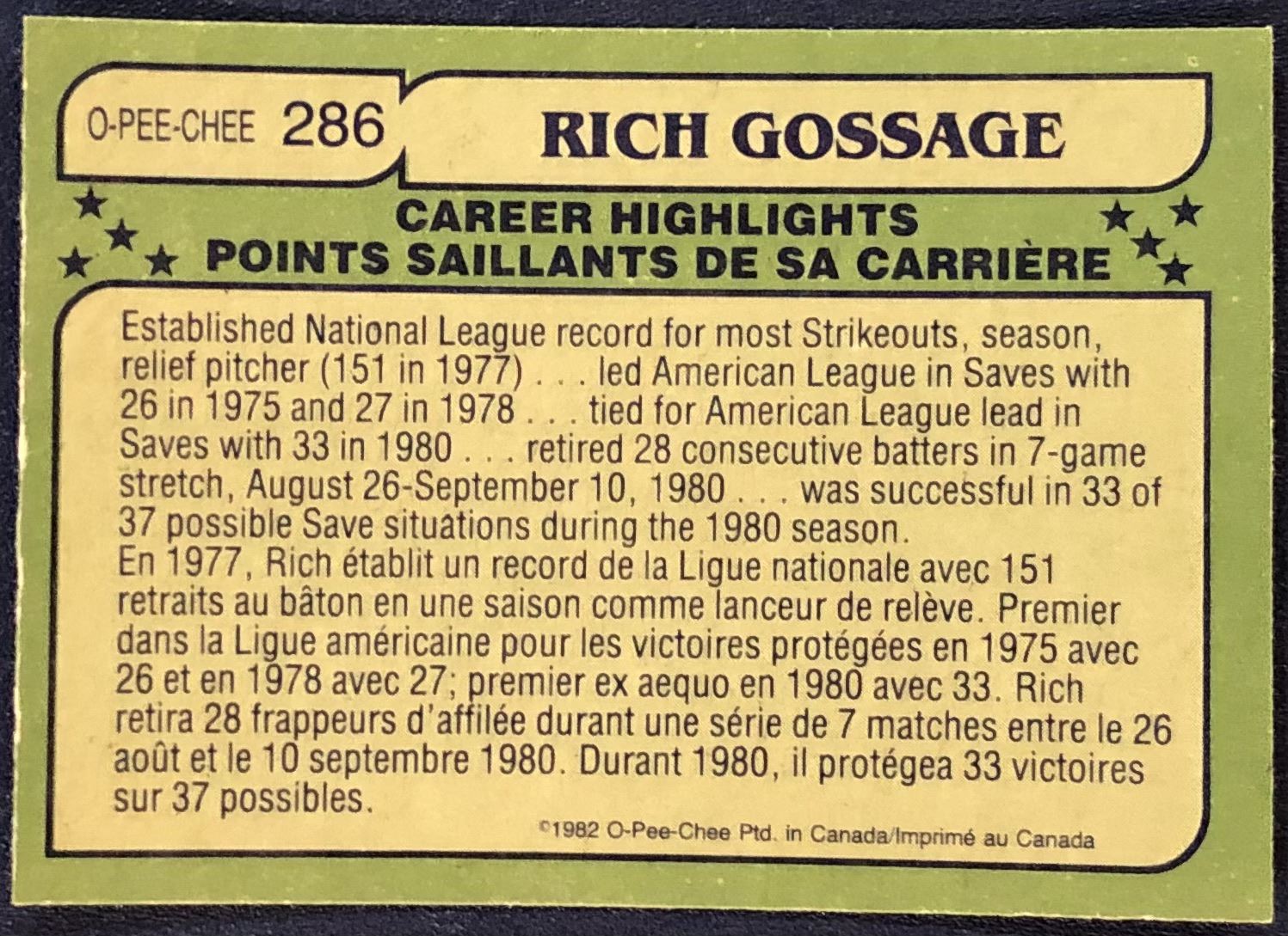 Lot 643 1982 O-PEE-CHEE BASEBALL GOOSE GOSSAGE (HOF)
