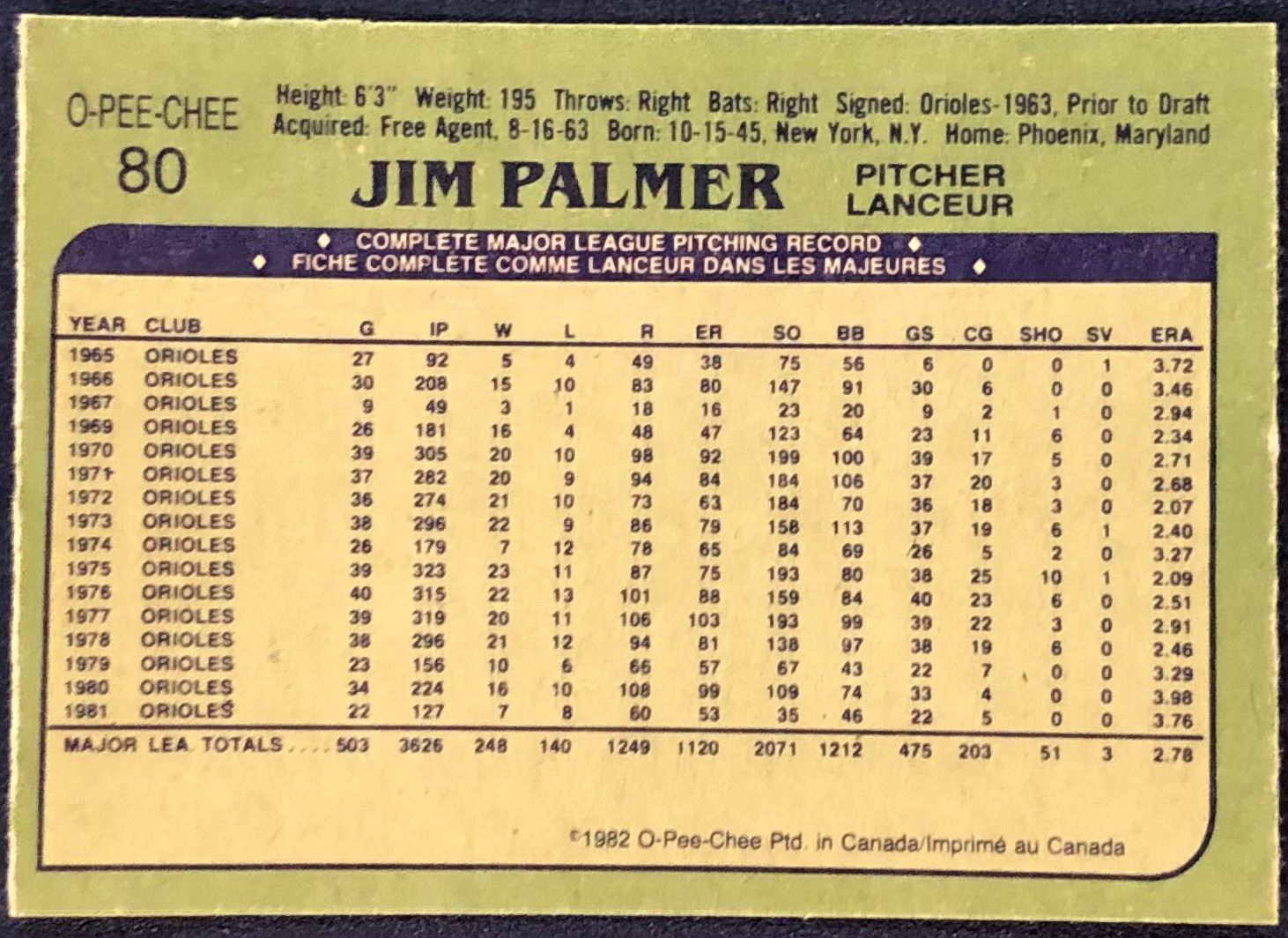 Lot 648 1982 O-PEE-CHEE BASEBALL JIM PALMER (HOF)