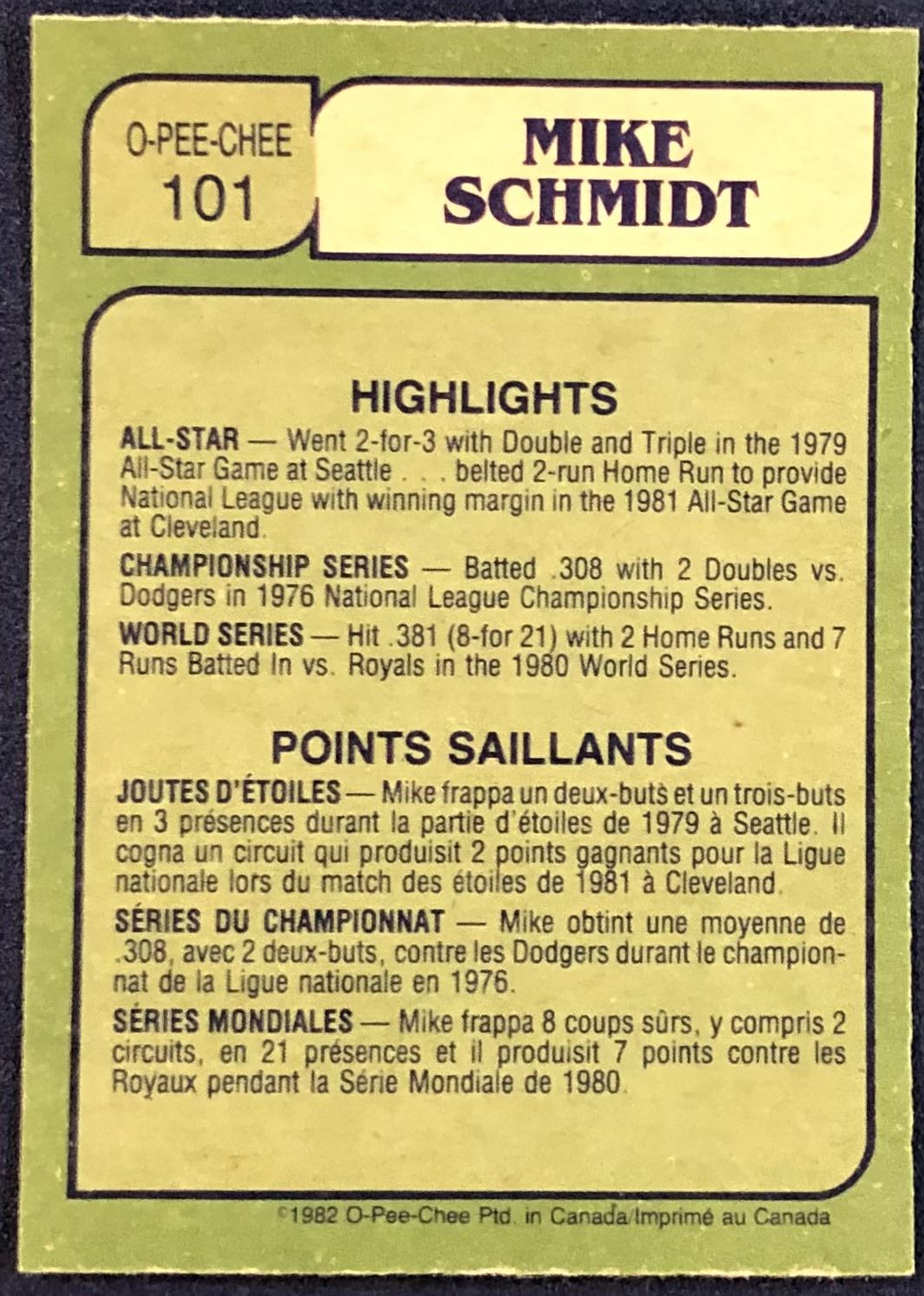 Lot 656 1982 O-PEE-CHEE BASEBALL MIKE SCHMIDT (HOF)