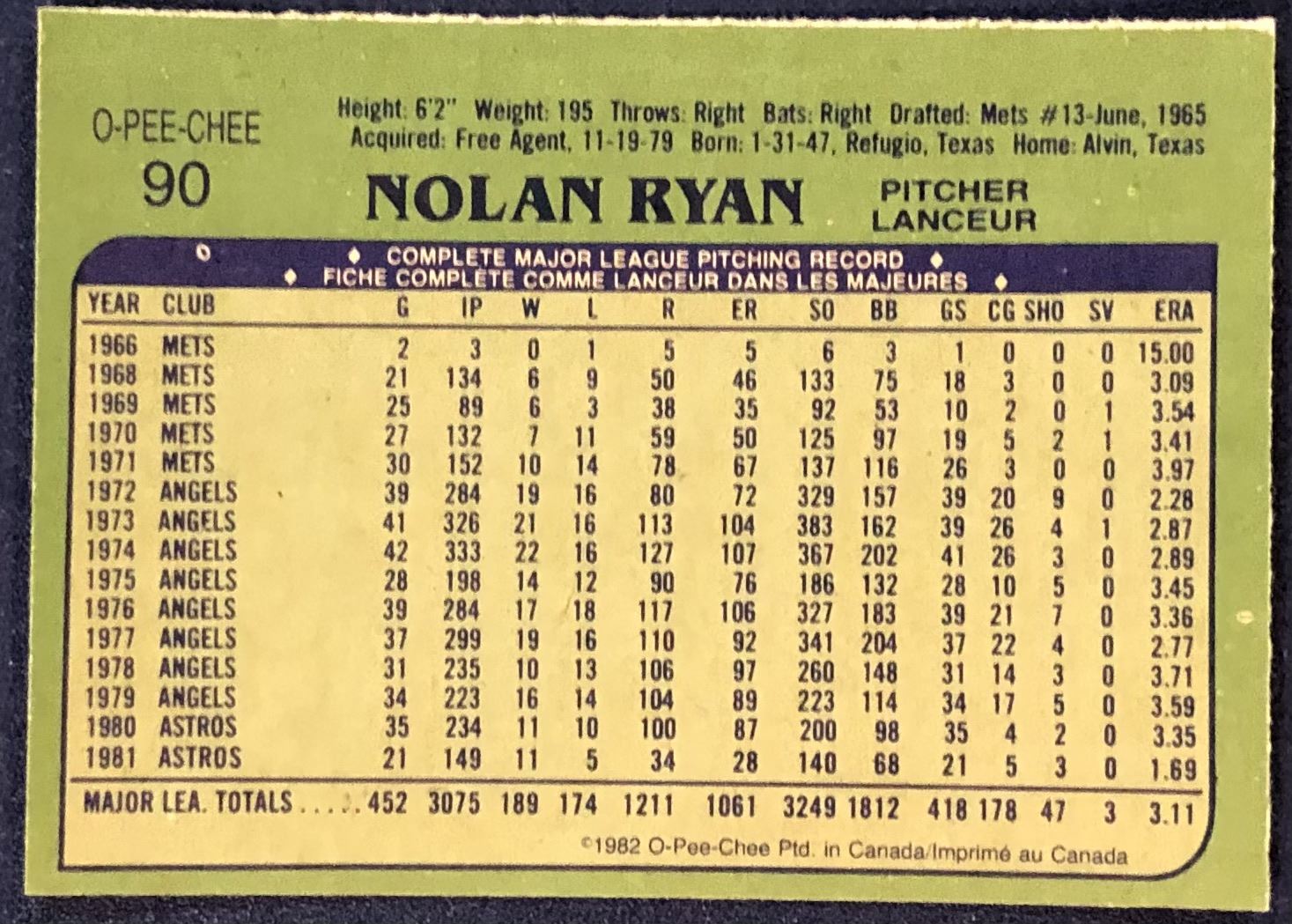 Lot 657 1982 O-PEE-CHEE BASEBALL NOLAN RYAN (HOF)