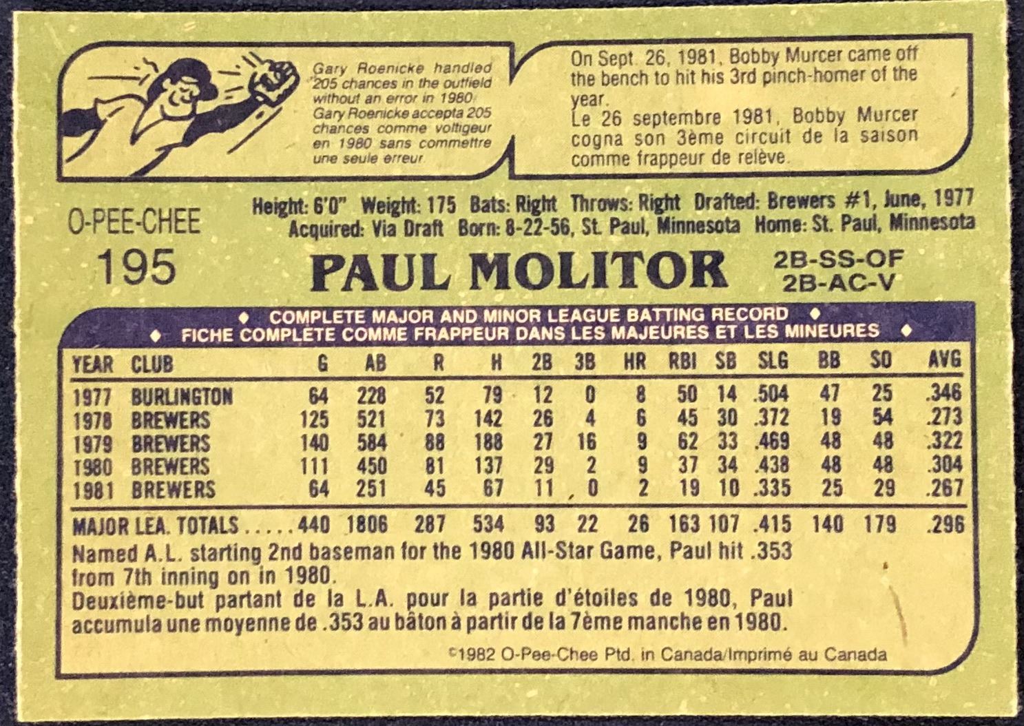 Lot 659 1982 O-PEE-CHEE BASEBALL PAUL MOLITOR (HOF)