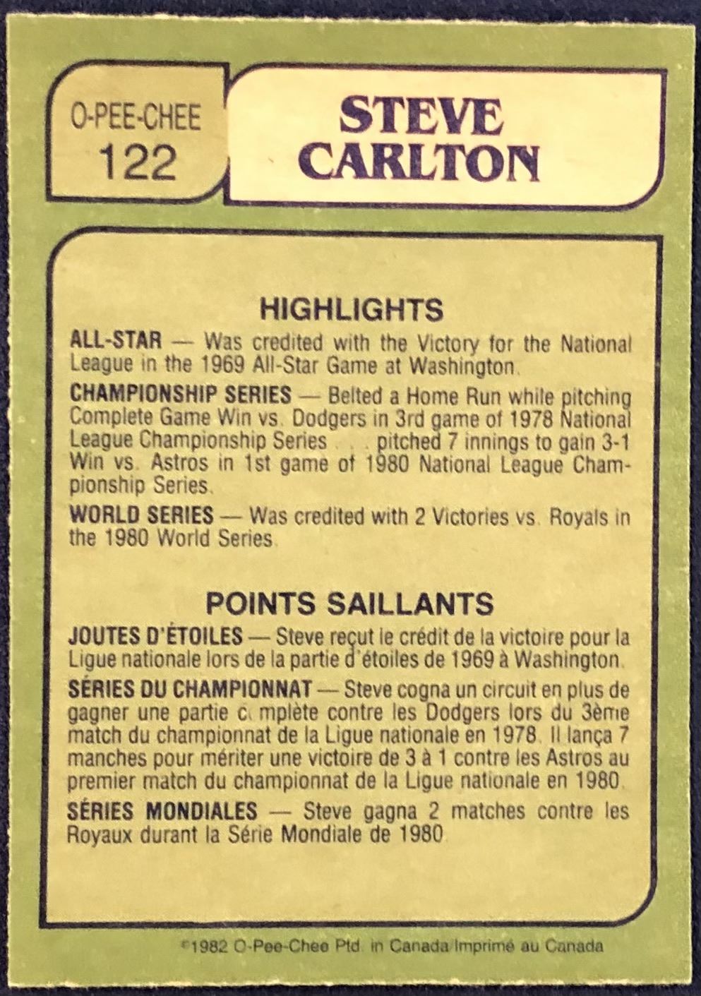 Lot 672 1982 O-PEE-CHEE BASEBALL STEVE CARLTON (HOF)