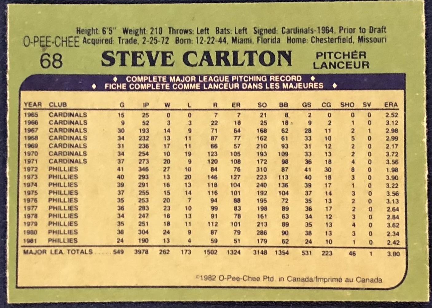 Lot 673 1982 O-PEE-CHEE BASEBALL STEVE CARLTON (HOF)