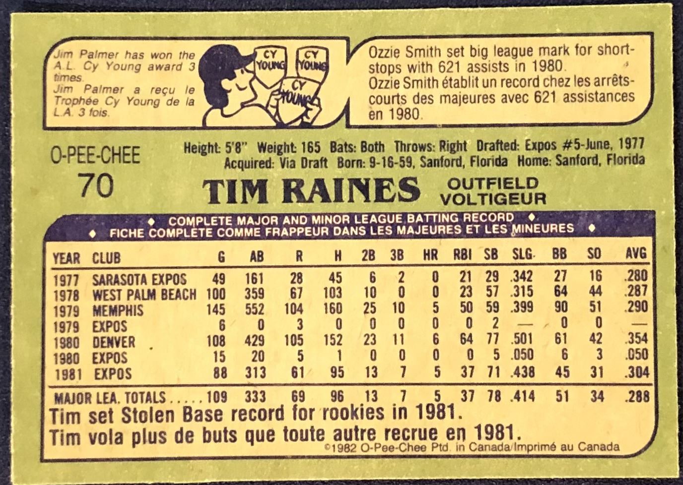 Lot 678 1982 O-PEE-CHEE BASEBALL TIM RAINES (HOF)