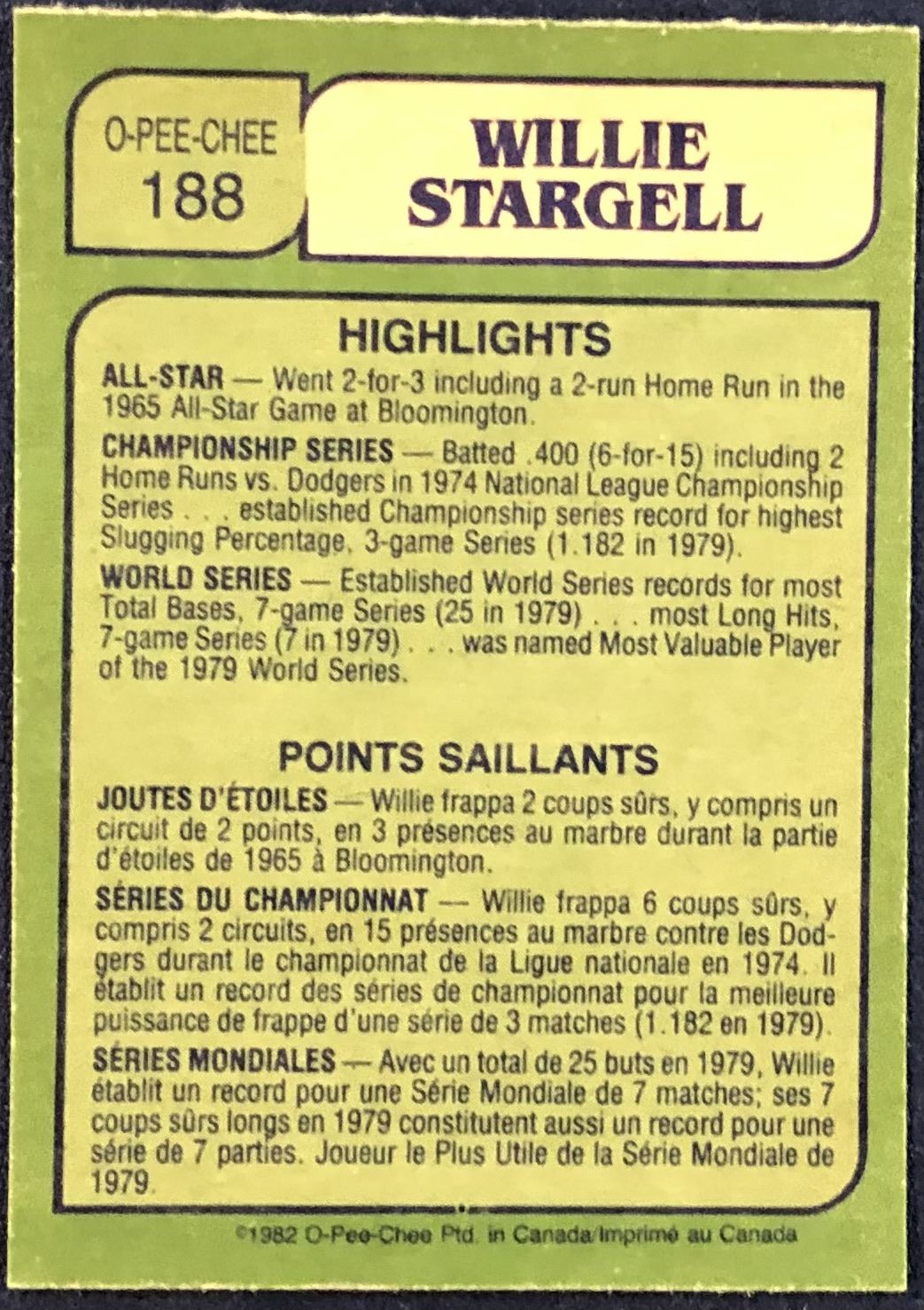Lot 684 1982 O-PEE-CHEE BASEBALL WILLIE STARGELL (HOF)
